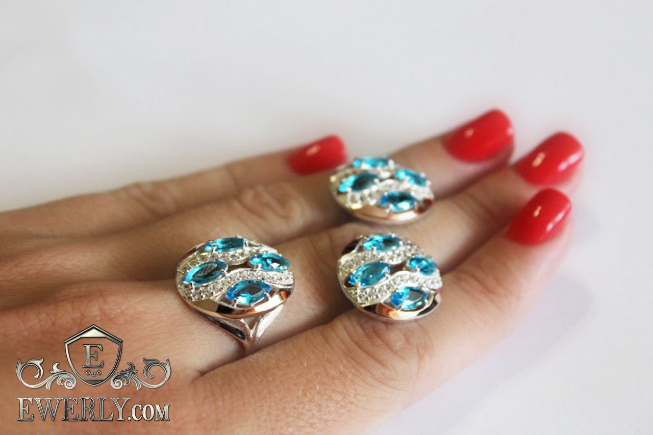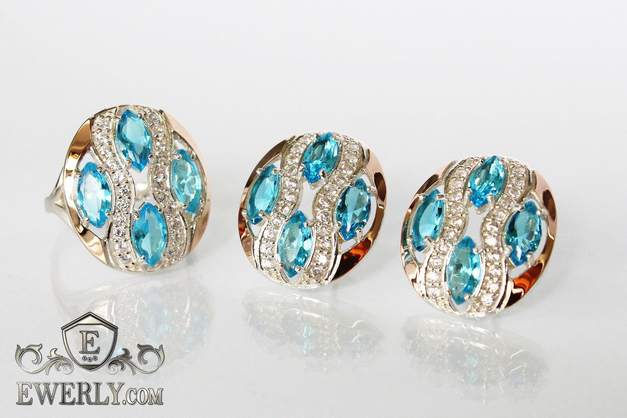 Set : earrings and ring of silver with gold and light blue stones