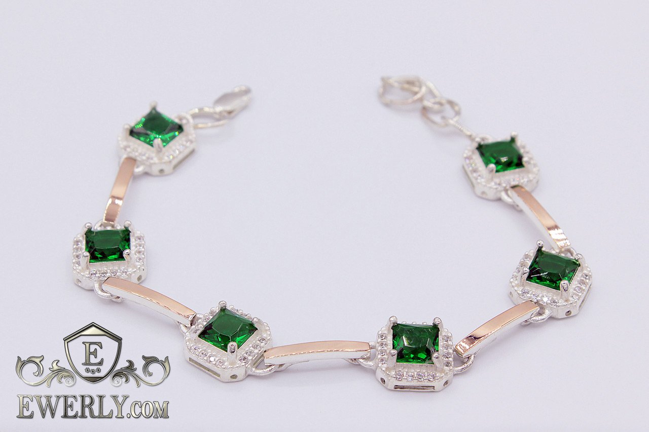 Full-fledged bracelet. Women's bracelet made of silver with gold inserts and stones (green fianites).