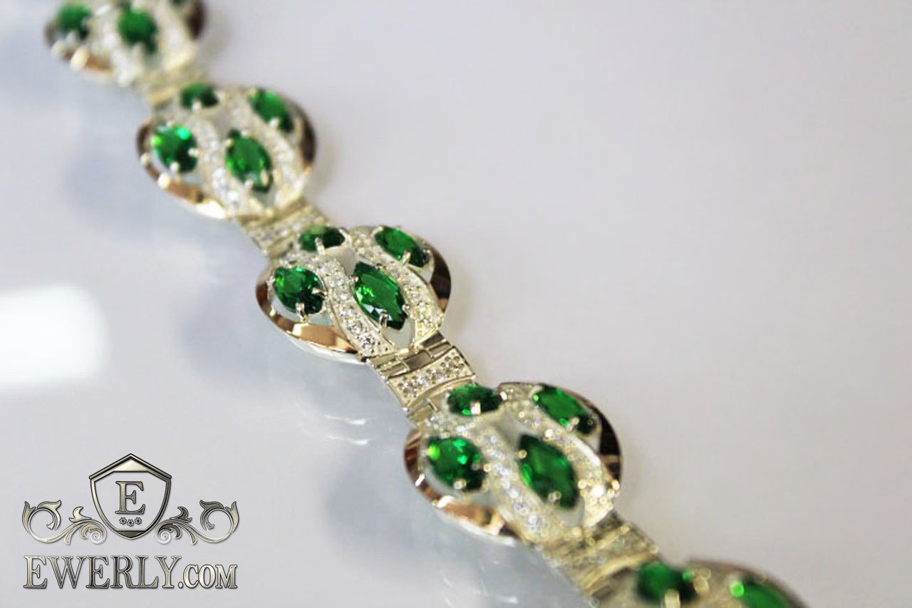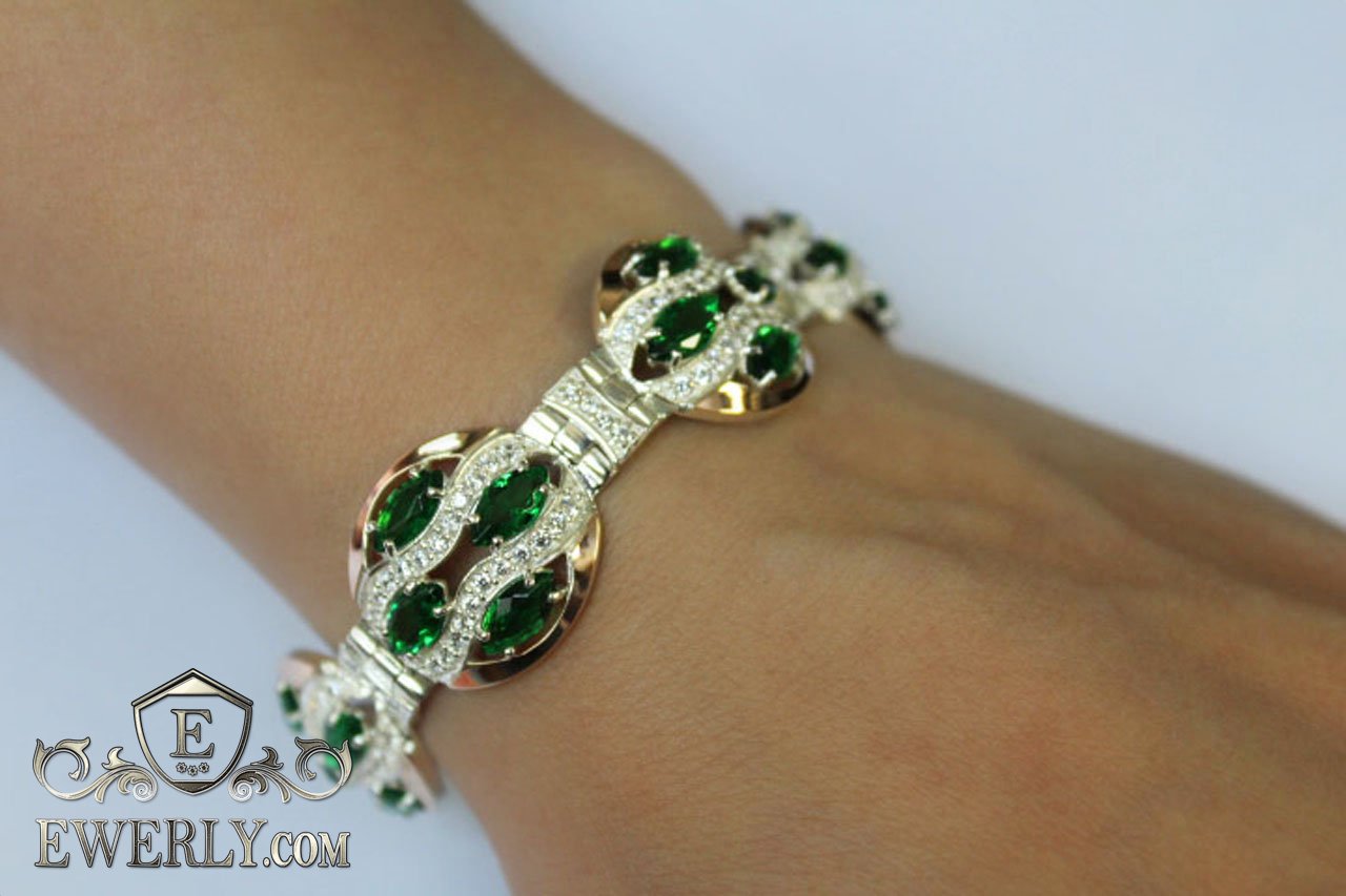 Full-fledged bracelet. Women's silver bracelet with green fianites and gold inserts.