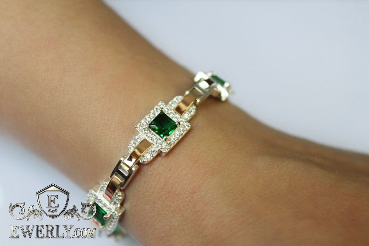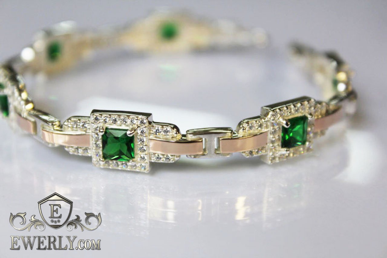 Full-fledged bracelet. Women's bracelet made of silver with gold inserts and stones (green fianites).