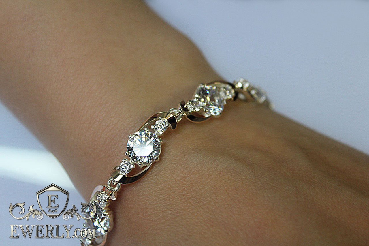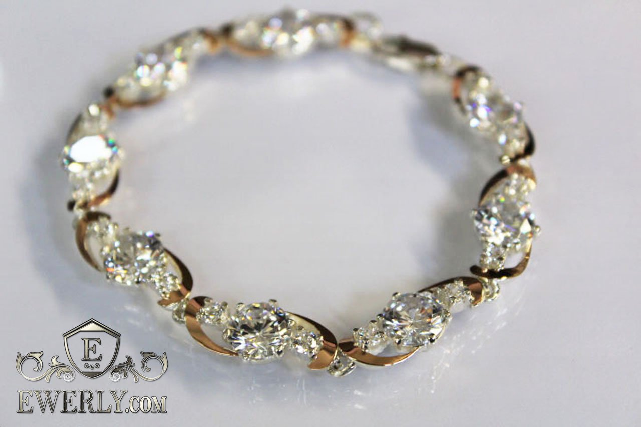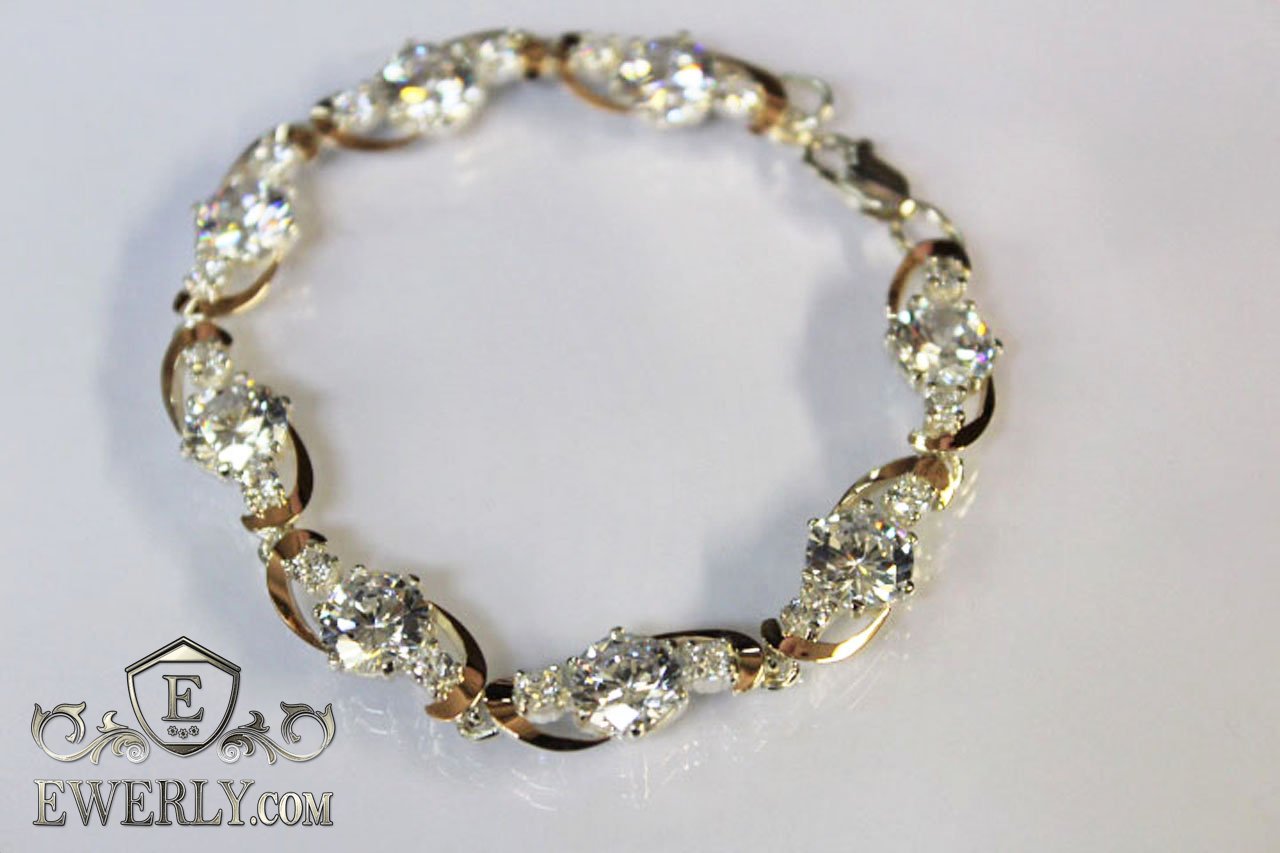 Full-fledged bracelet. Women's silver bracelet with white fianites and gold inserts.