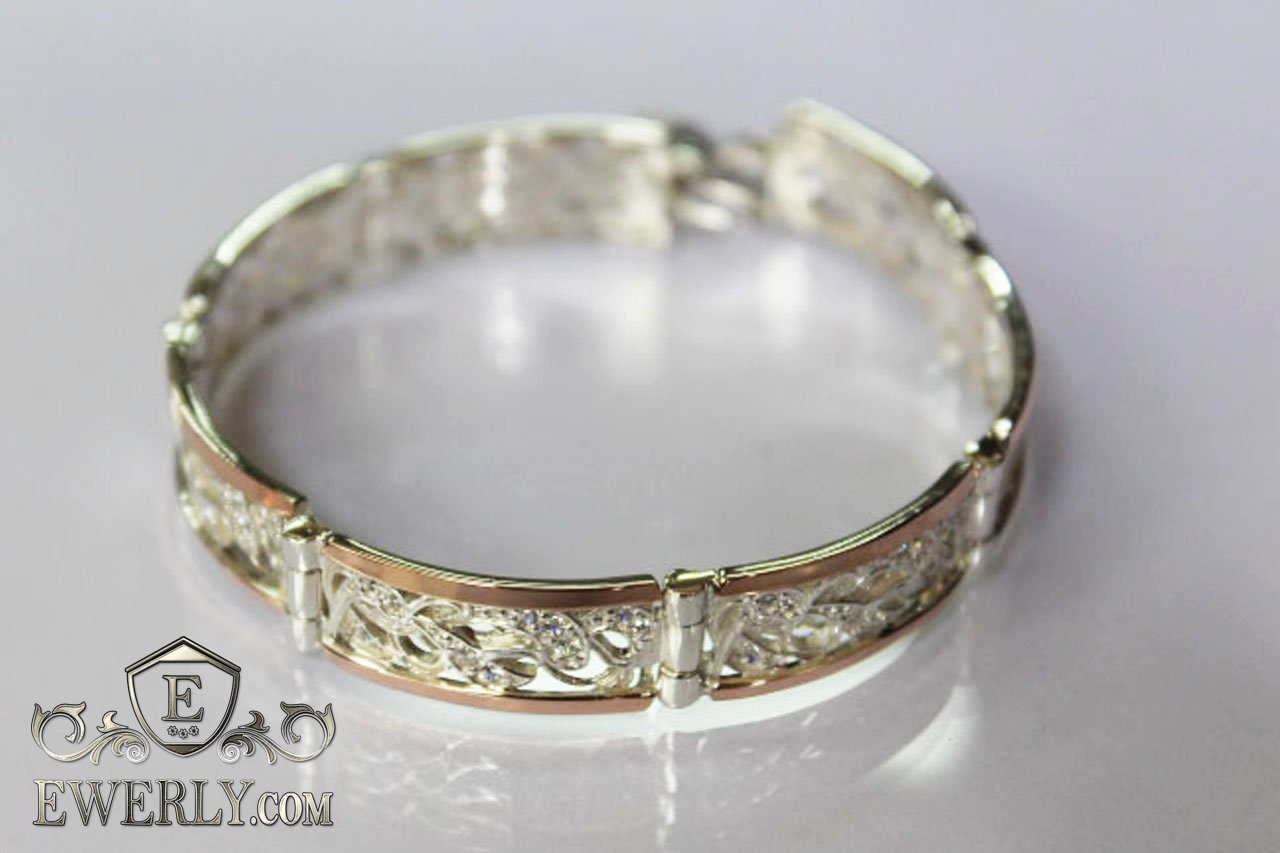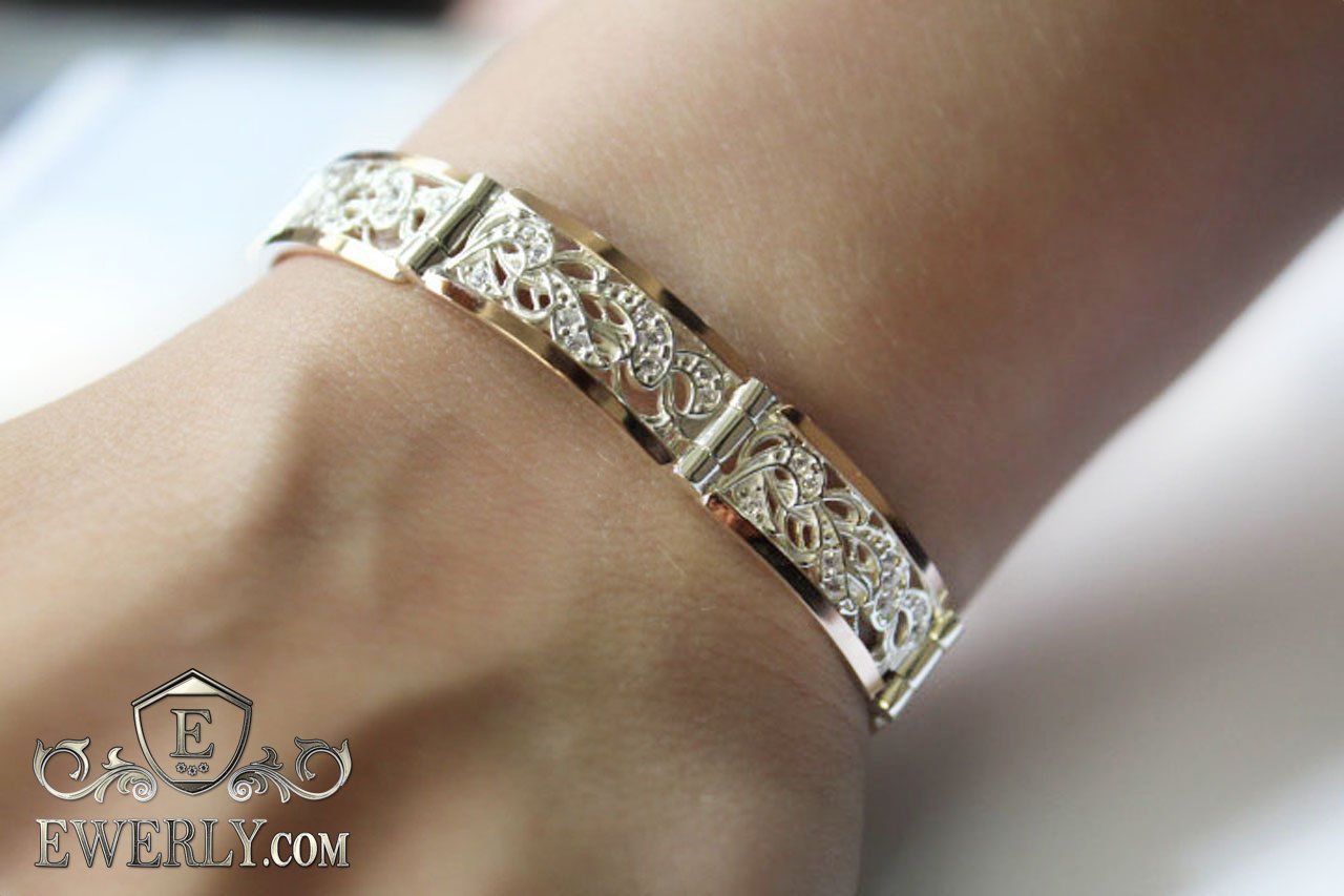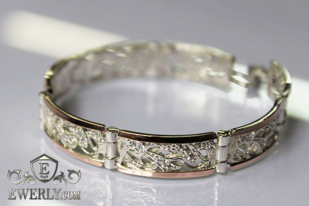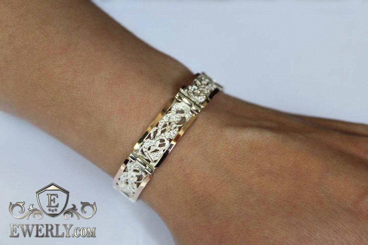 Full-fledged bracelet. Women's bracelet made of silver with gold inserts and stones (white fianites).