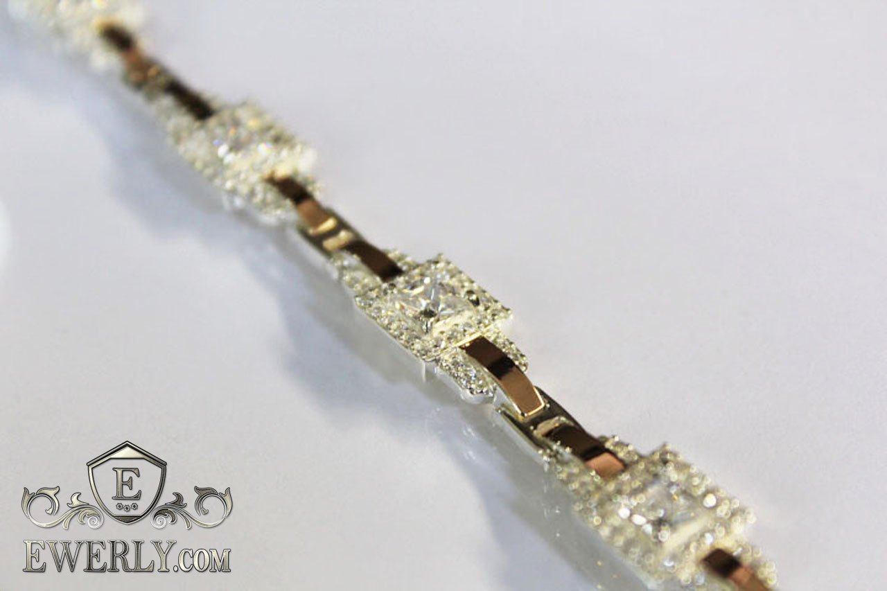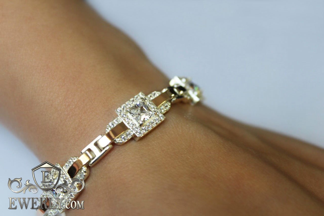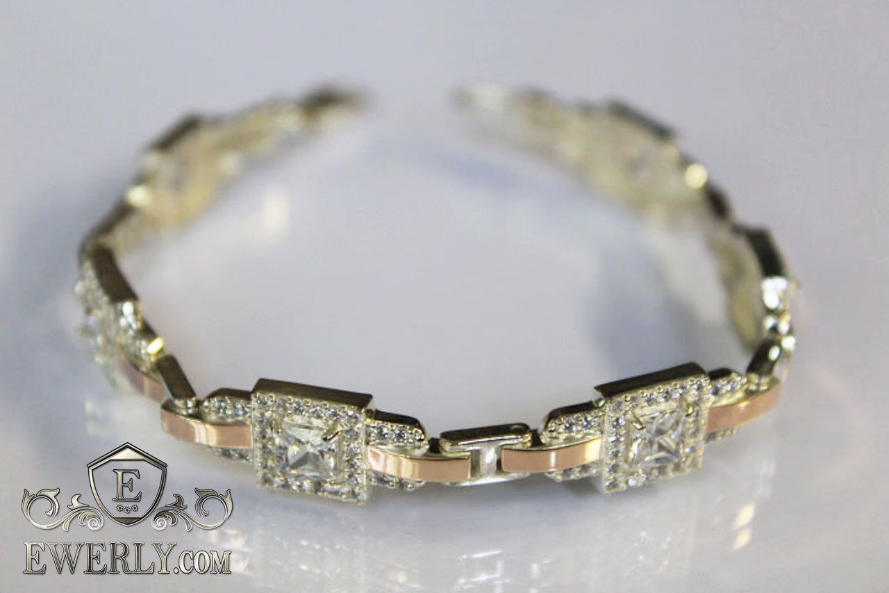 Full-fledged bracelet. Women's bracelet made of silver with gold inserts and stones (white fianites).