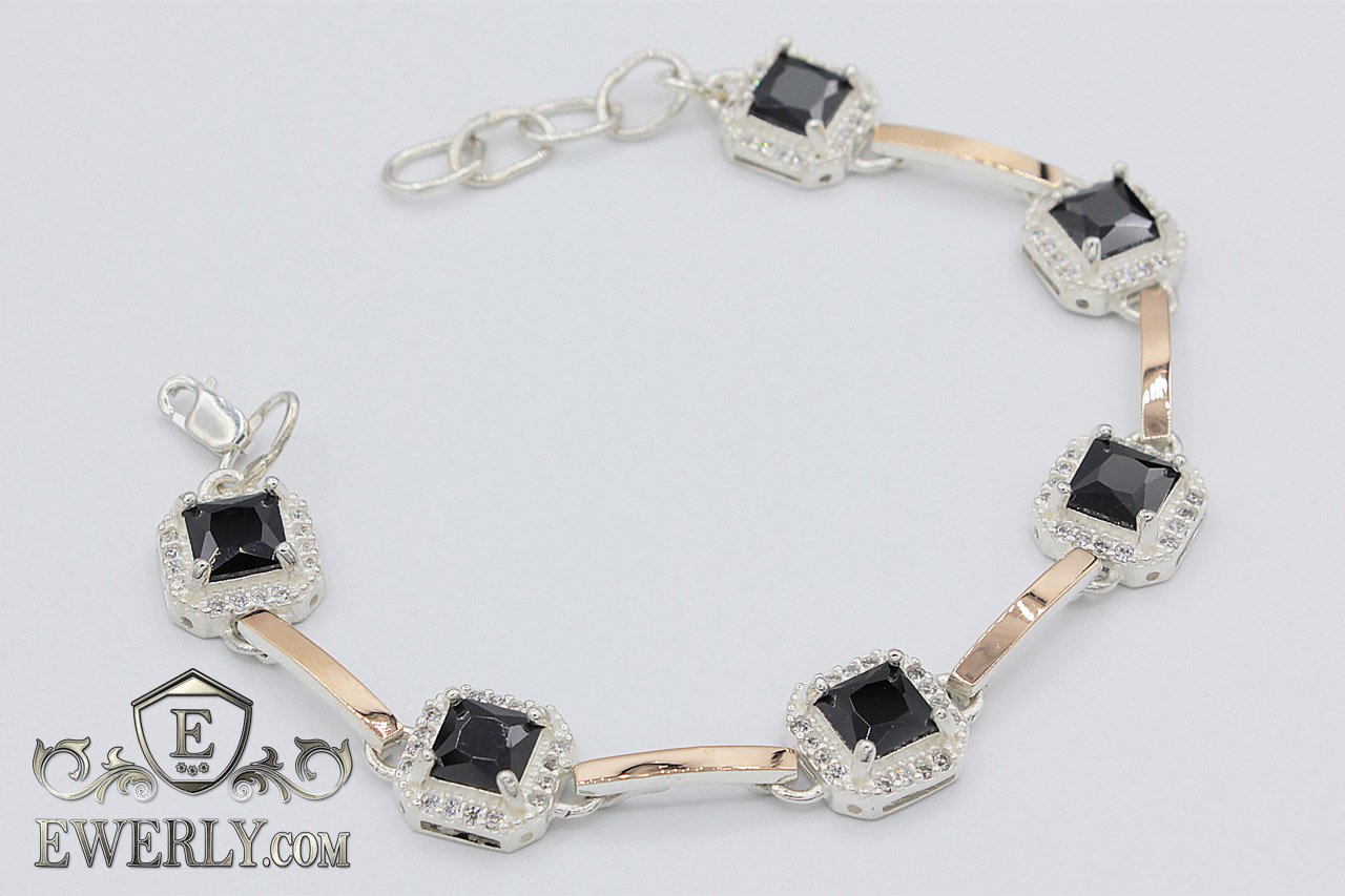 Full-fledged bracelet. Women's bracelet made of silver with gold inserts and stones (black fianites).