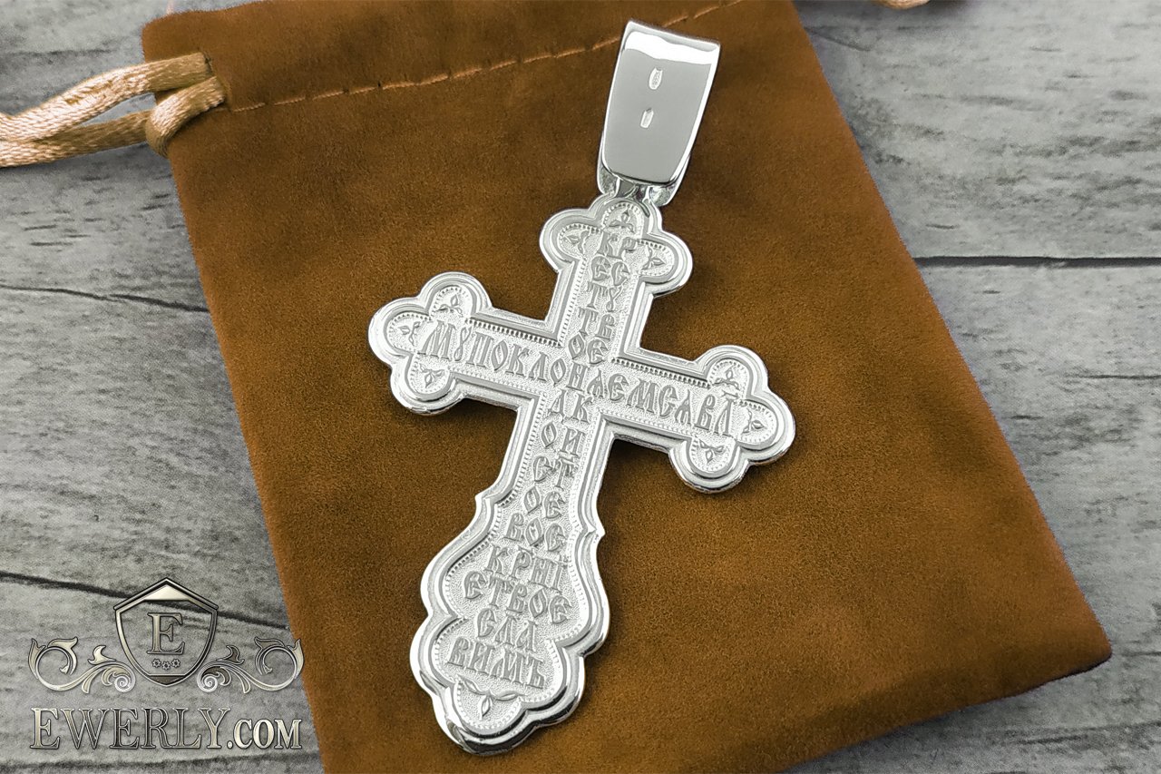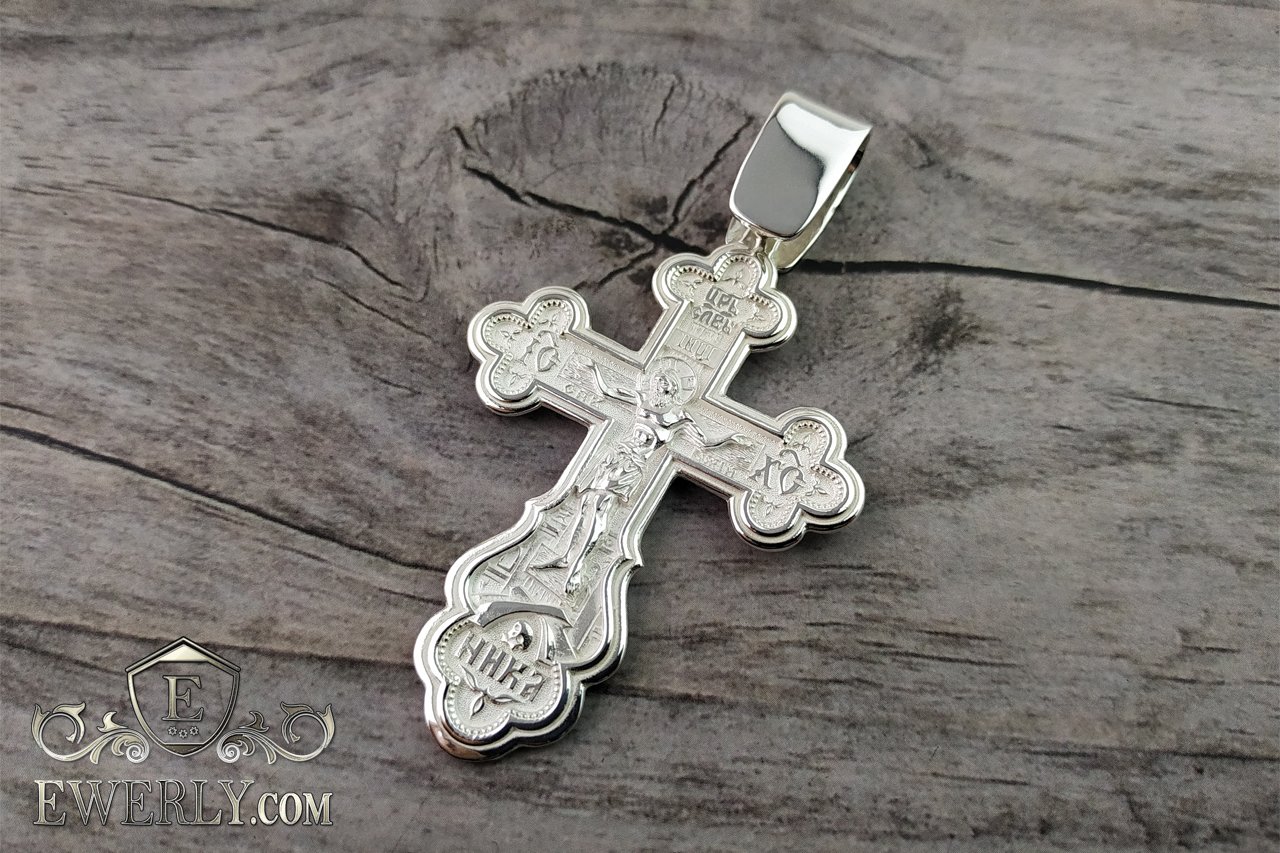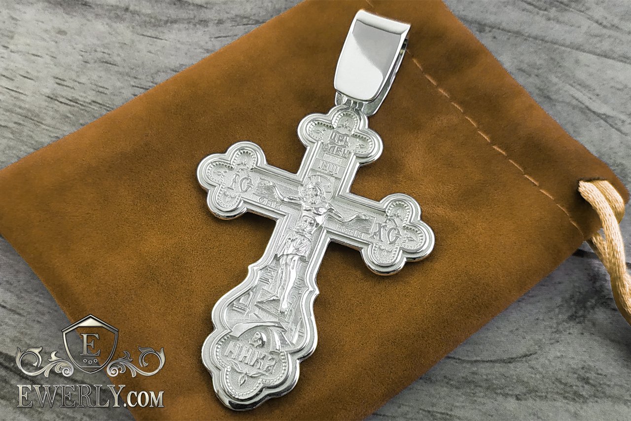 In the photo: Orthodox silver cross with the crucifixion of Christ. Prayer to Christ. Length: 5.7 cm