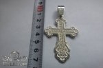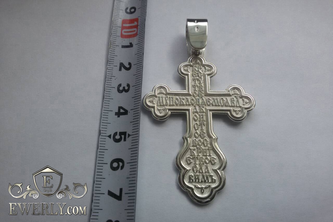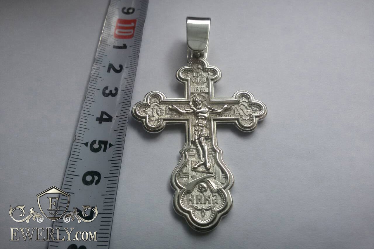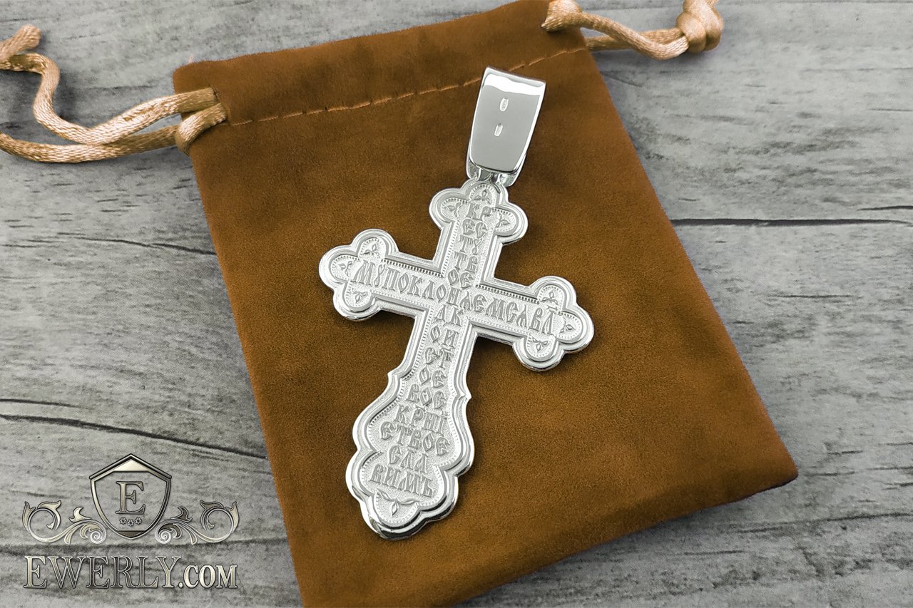 In the photo: Orthodox silver cross with the crucifixion of Christ. Prayer to Christ. Length: 5.7 cm