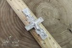 The crucifixion of Jesus Christ is depicted on the front side of the cross. The prayer "Our Father" is written on the back.