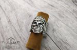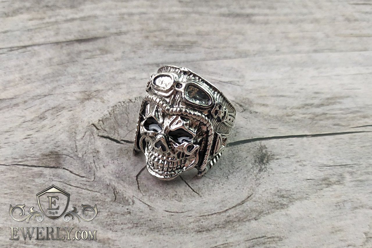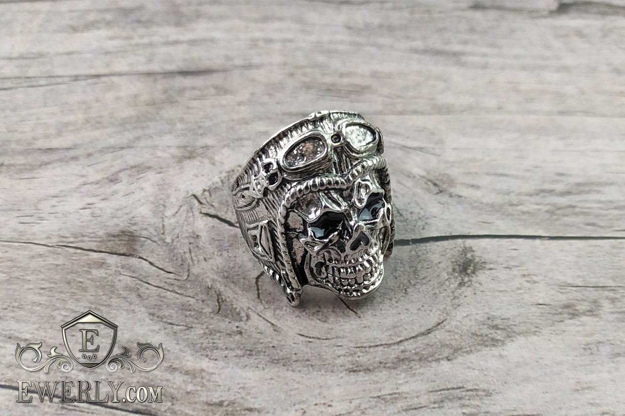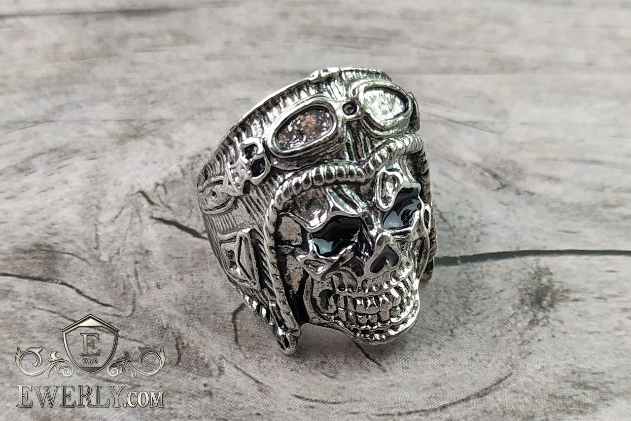 The photo shows a silver ring for men - a skull made of 925 sterling silver with black enamel.