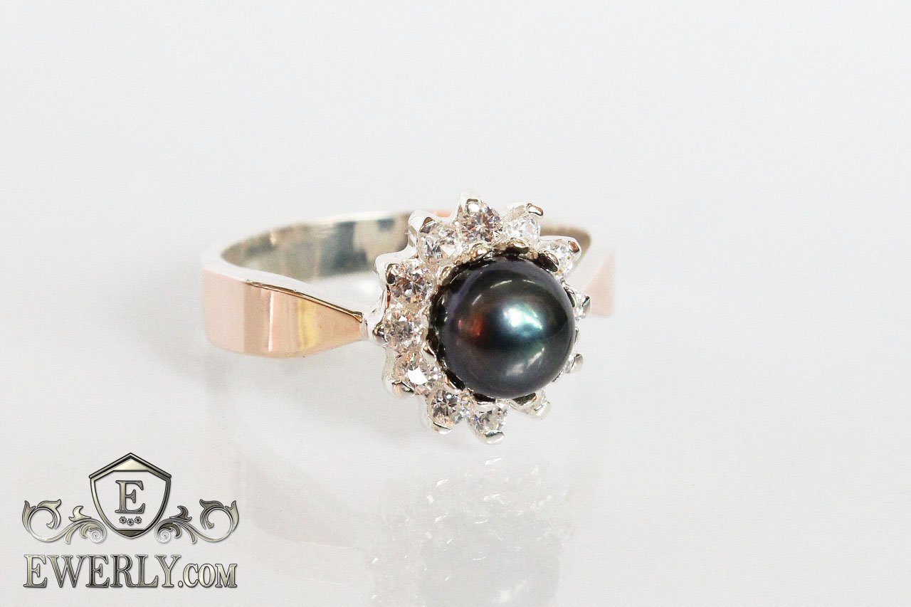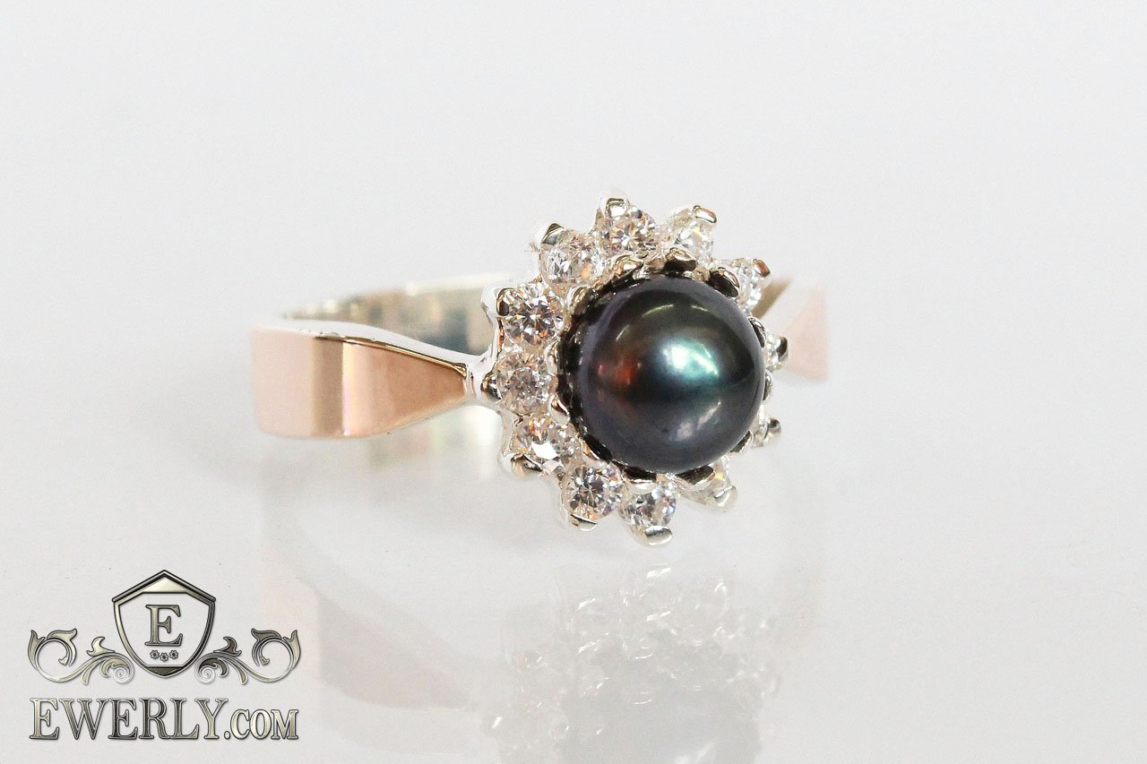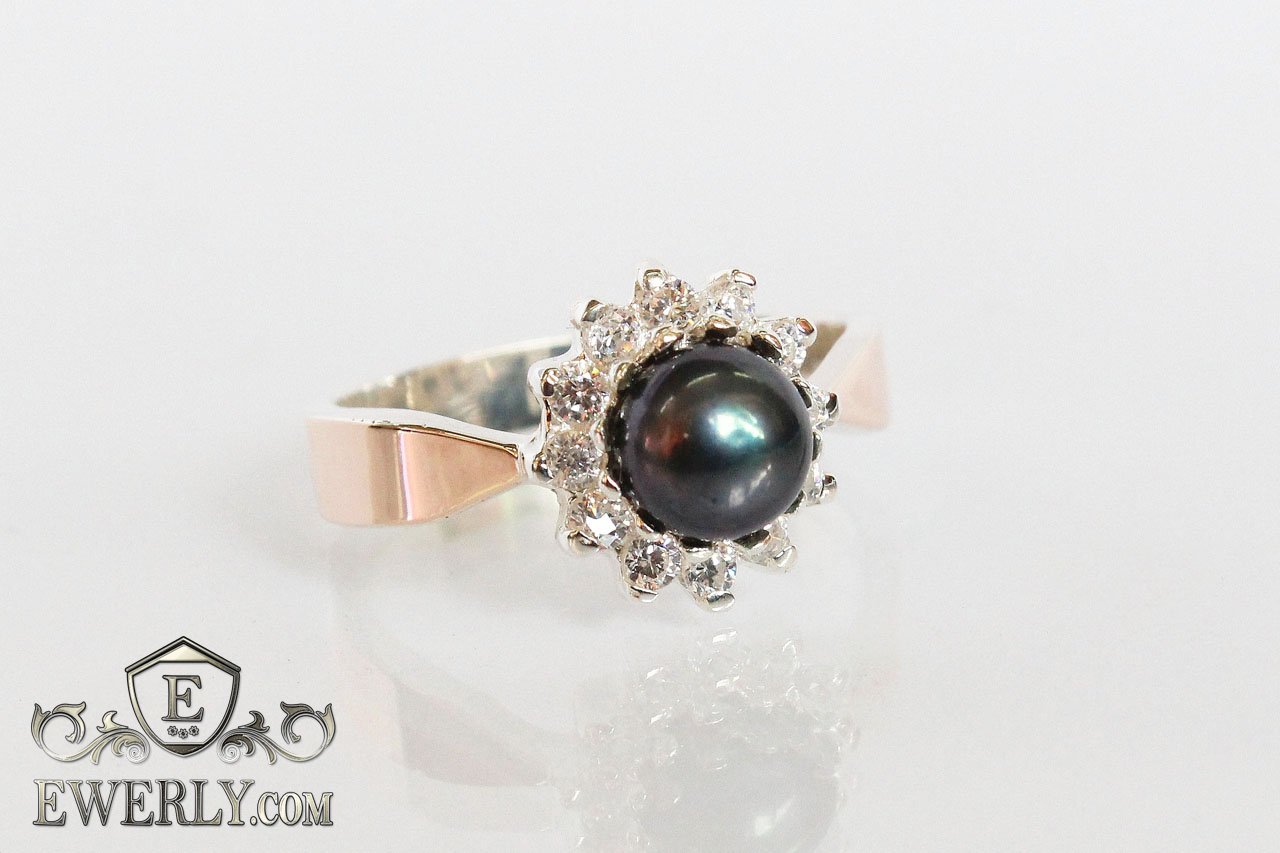 Women's silver ring with gold and black cubic zirconia in the form of a pearl