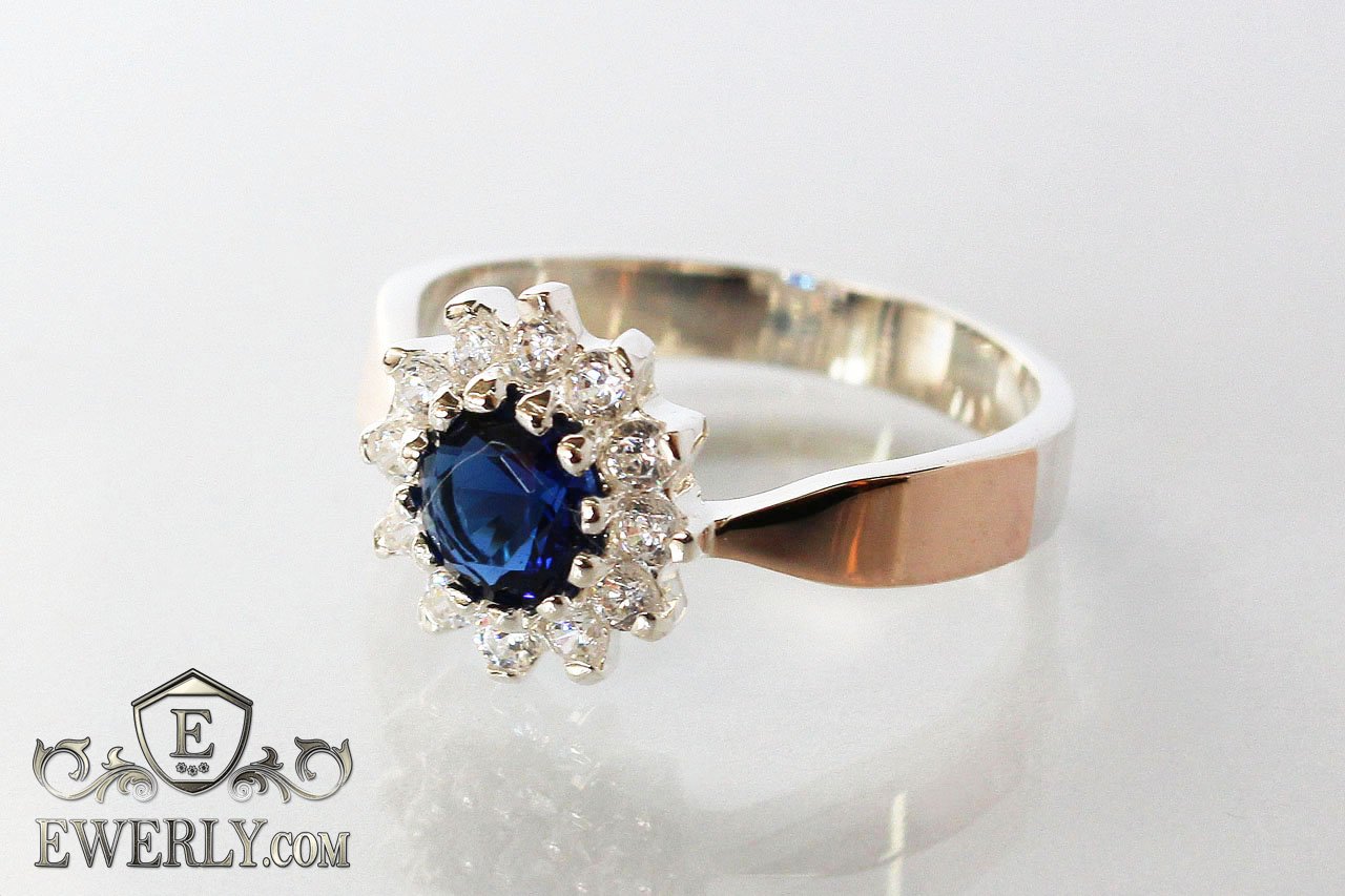 A ring that captivates at first sight: in the center of the composition is a large cubic zirconia of a deep blue hue in a multifaceted cut. It shines in the frame of a star pattern, the rays of which are laid out from sparkling white stones, creating the effect of a soft glow and depth.