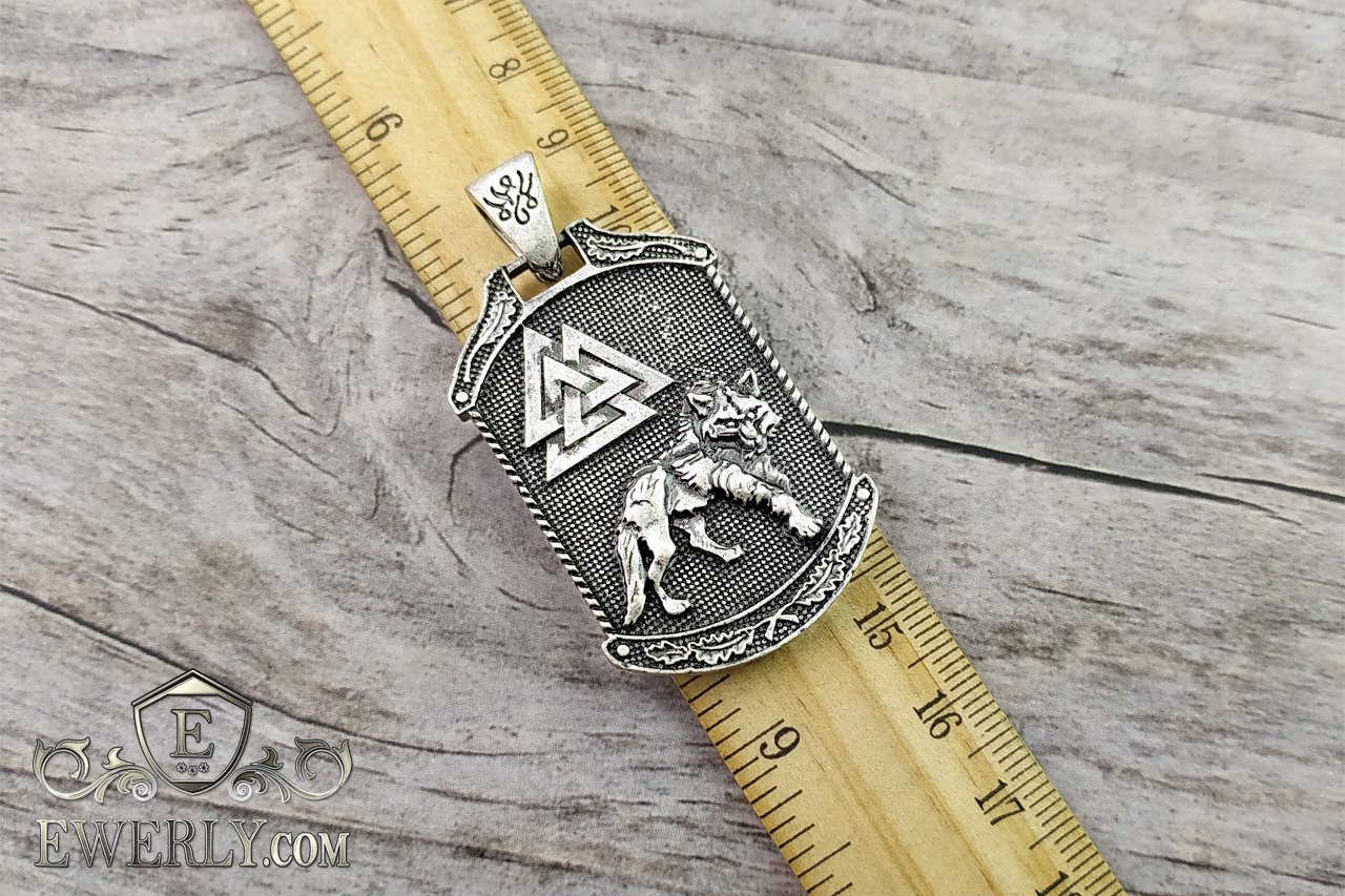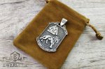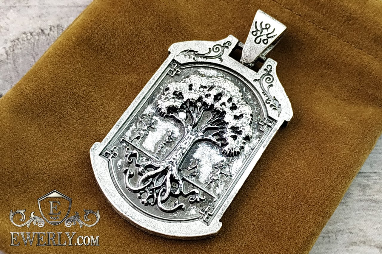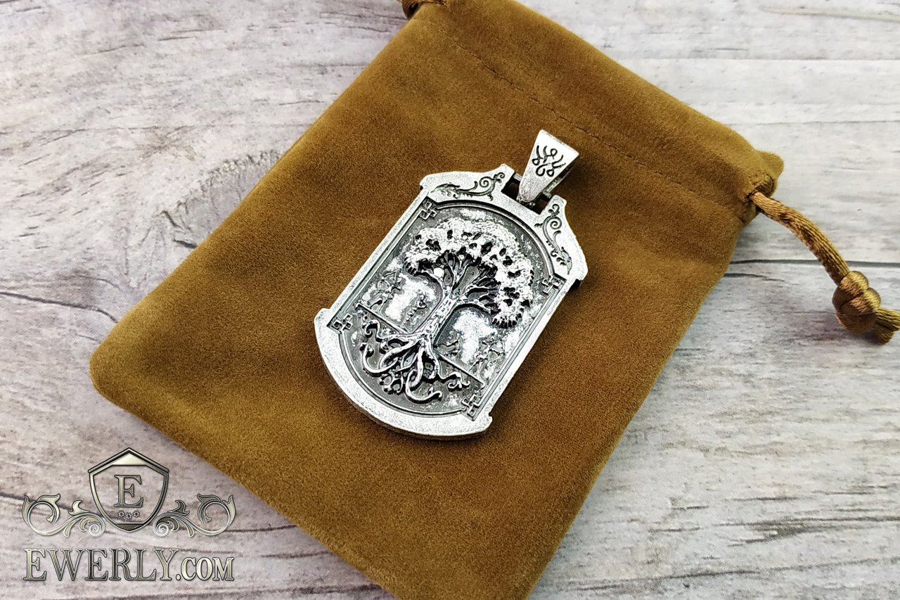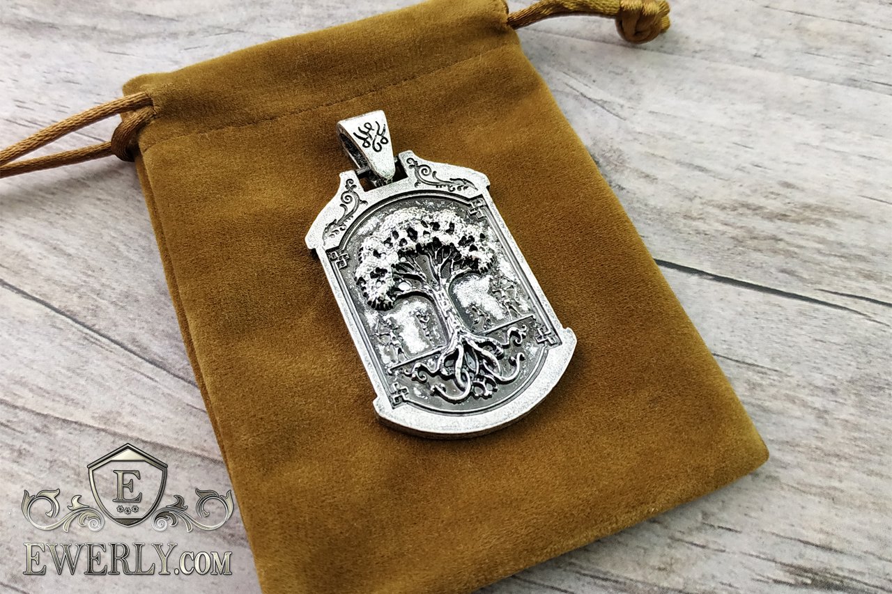 The photo shows a two-sided pendant-pendant made of sterling silver. "Tree of Life" is located on one side and a wolf on the other side. Amulet around his neck.
