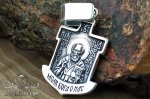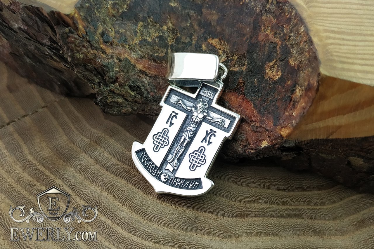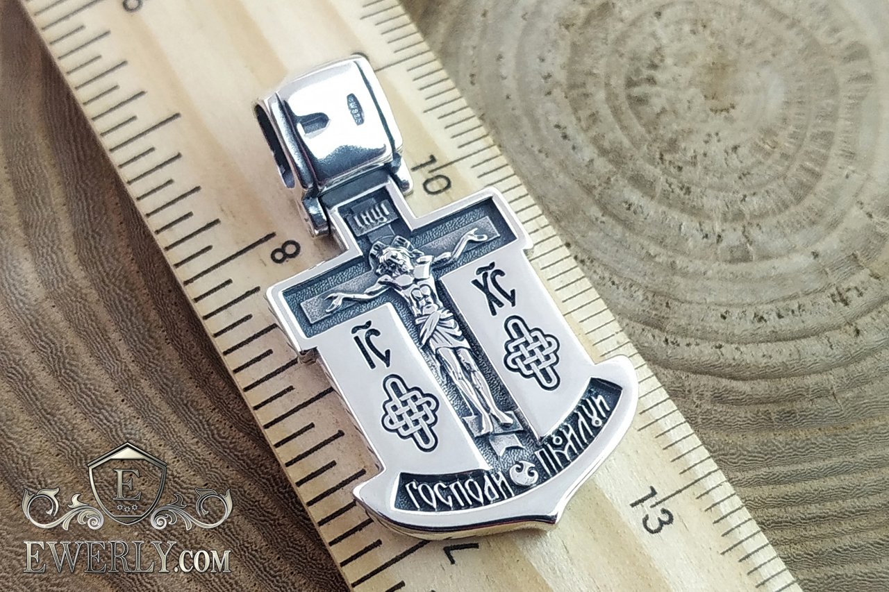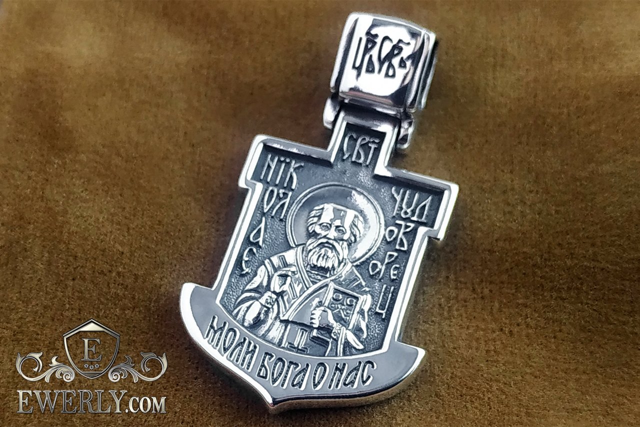 In the photo: Silver icon with the crucifix of Christ. Saint Nicholas. Length: 3 cm