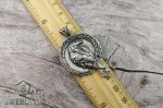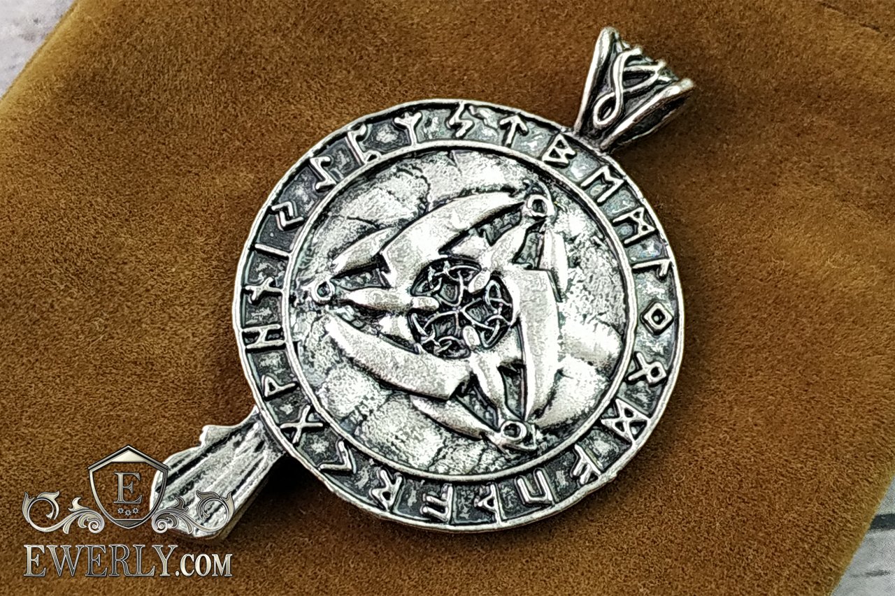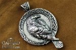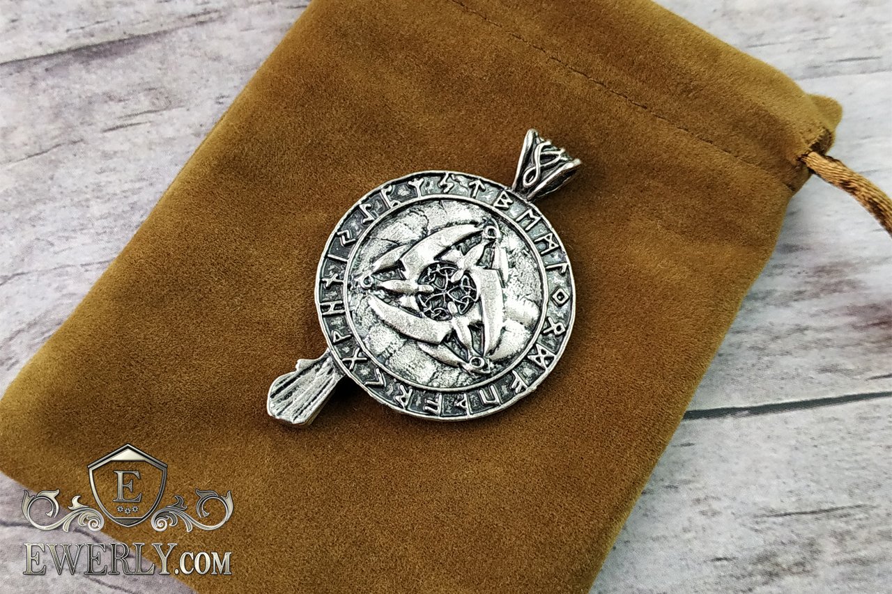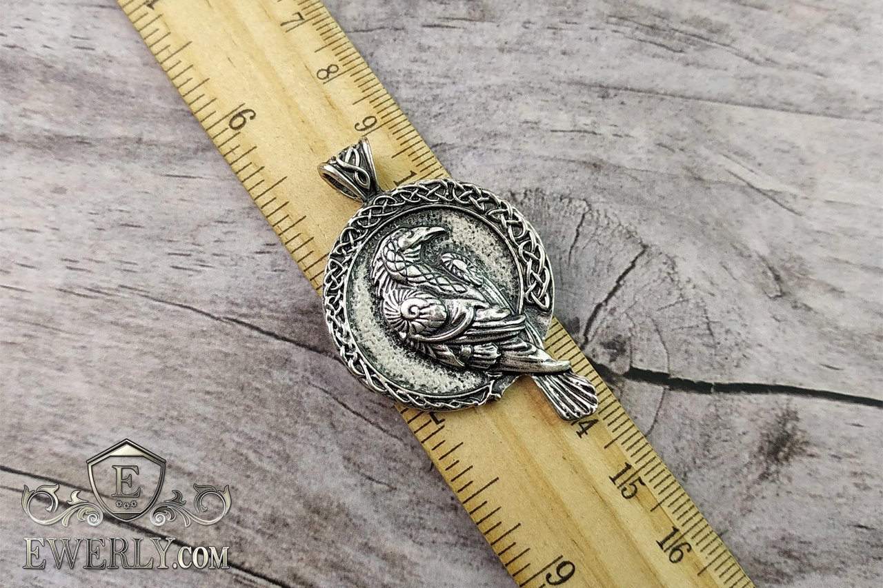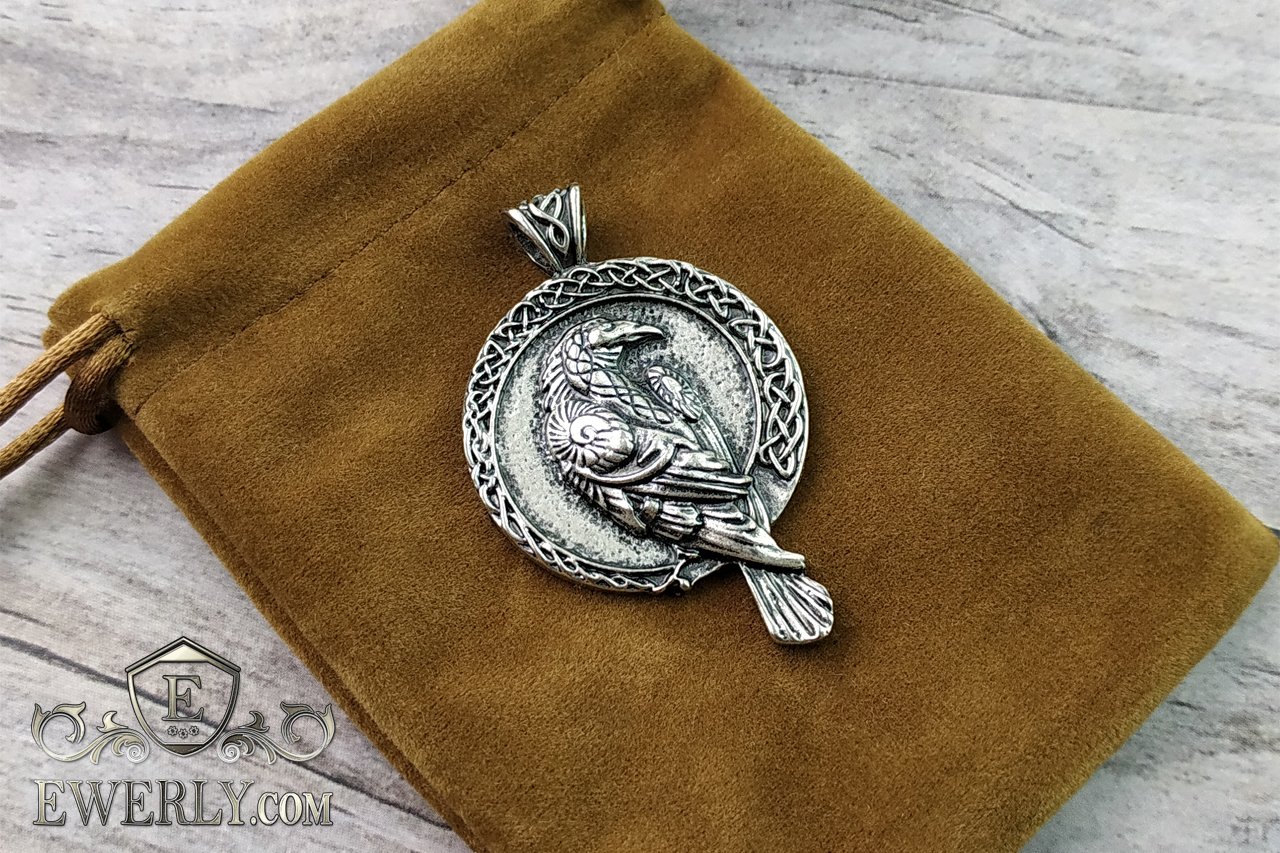 The photo shows a silver pendant with a raven. Pendant of sterling silver is a Scandinavian mascot around the neck.