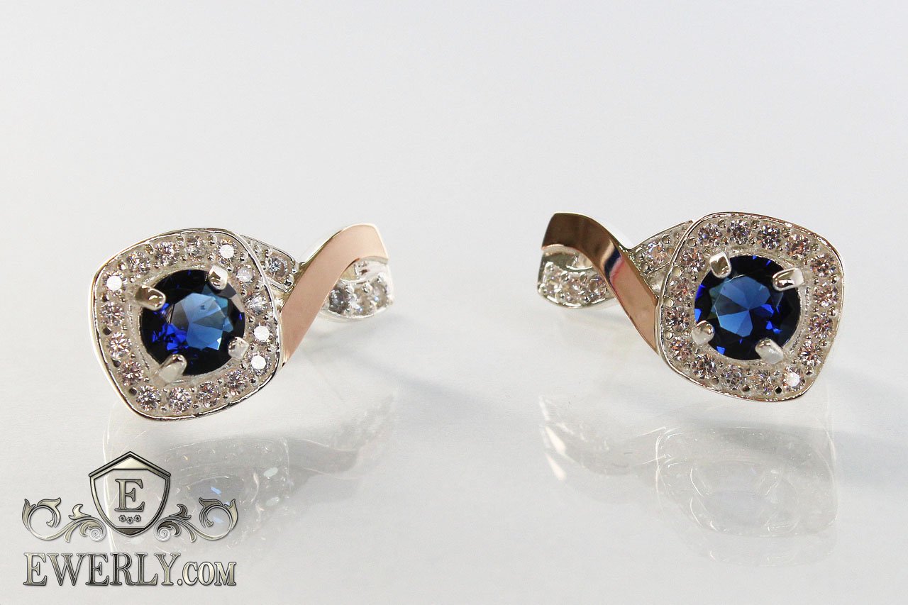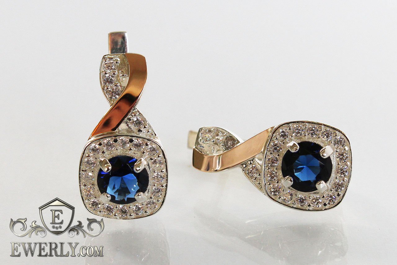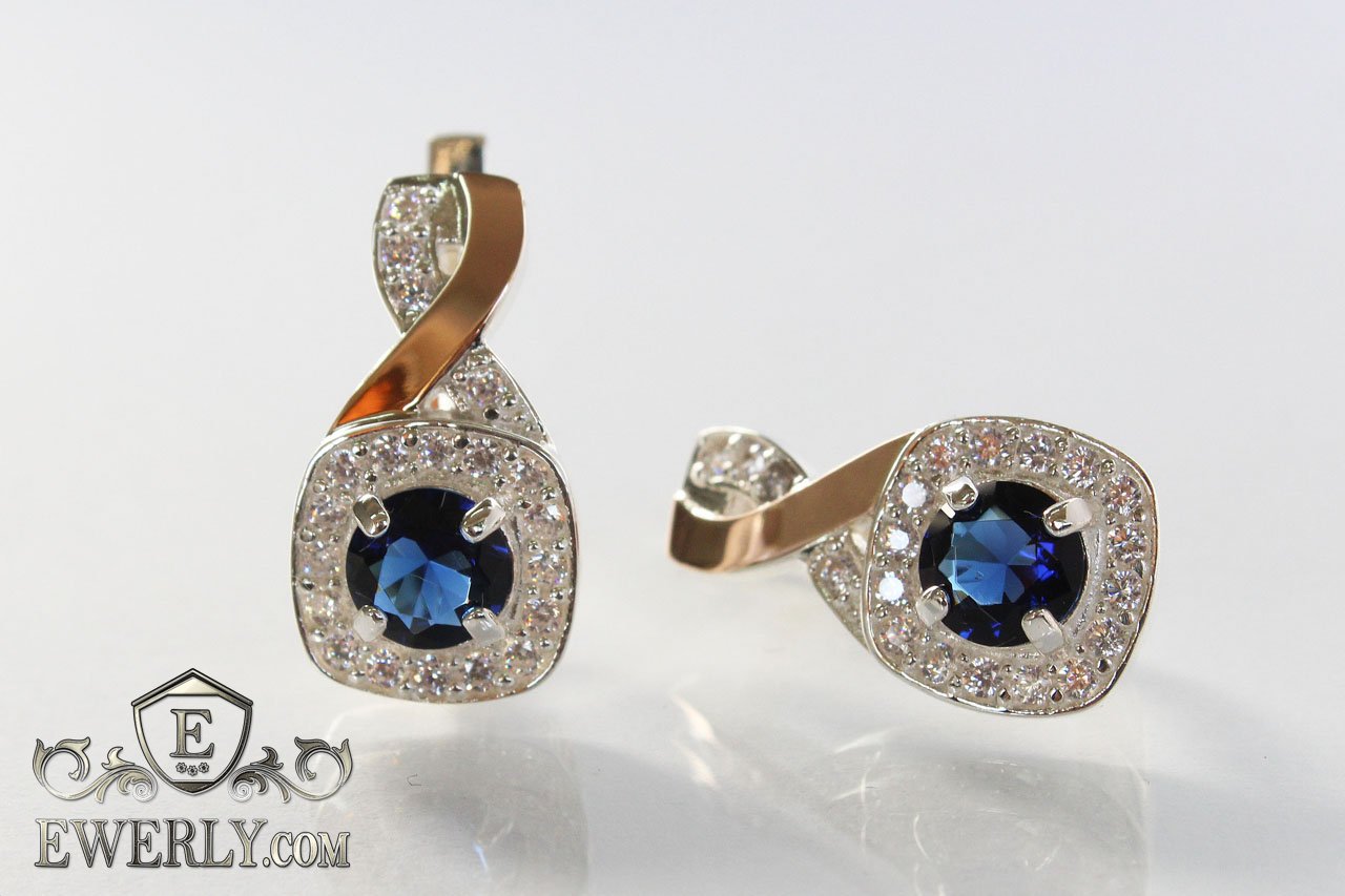 Женские серебряные серёжки 925 пробы с золотыми вставками 375 пробы с синими камнями.