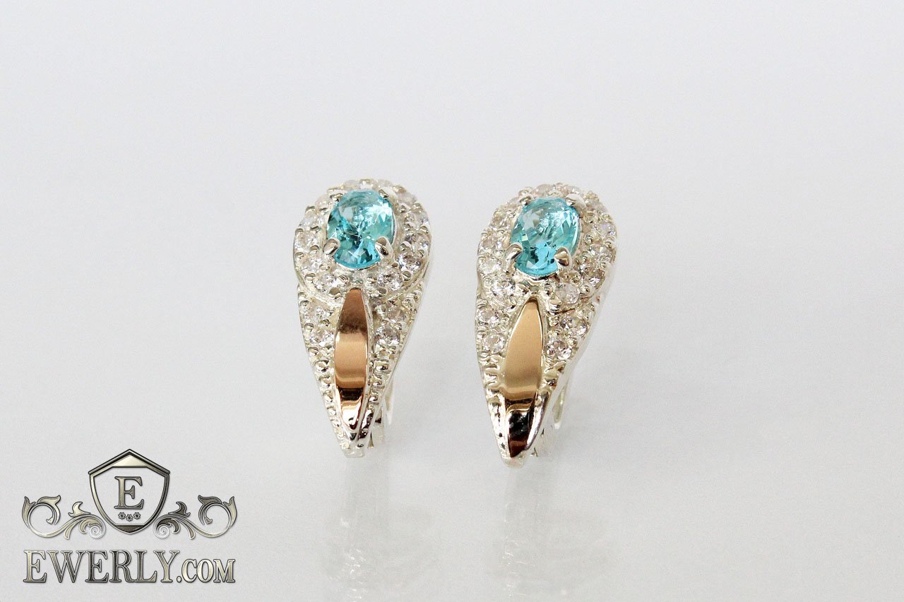 Серьги - капли из серебра с золотом и светло-голубыми камнями