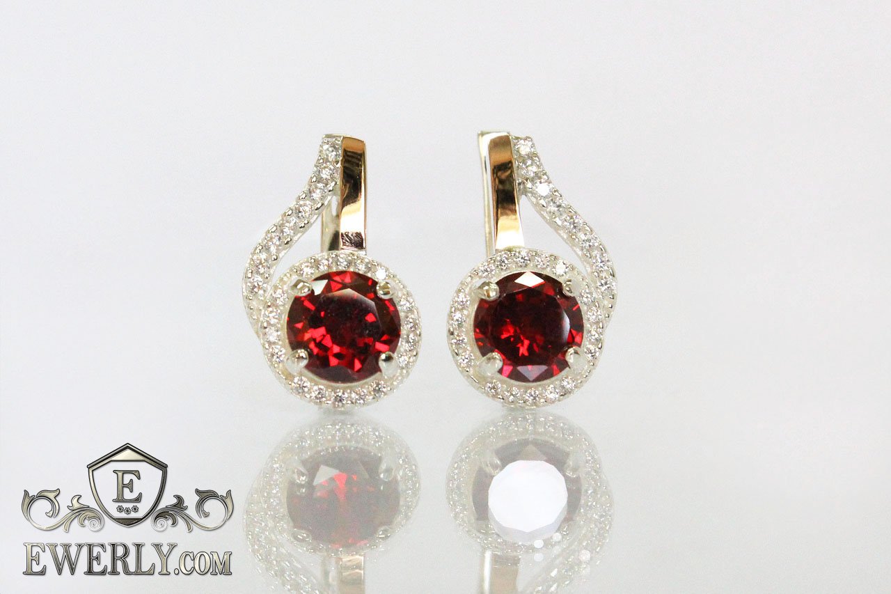 Женские серебряные серьги 925 пробы с золотыми пластинами 375 пробы с фианитами (гранатовый цвет).