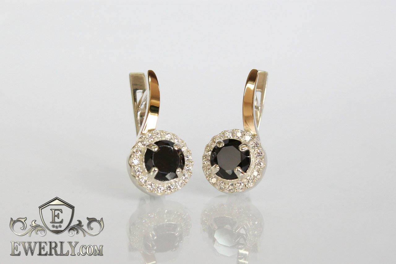 Женские серебряные серьги (серебро 925 пробы) с золотыми пластинами 375 пробы и чёрными фианитами.