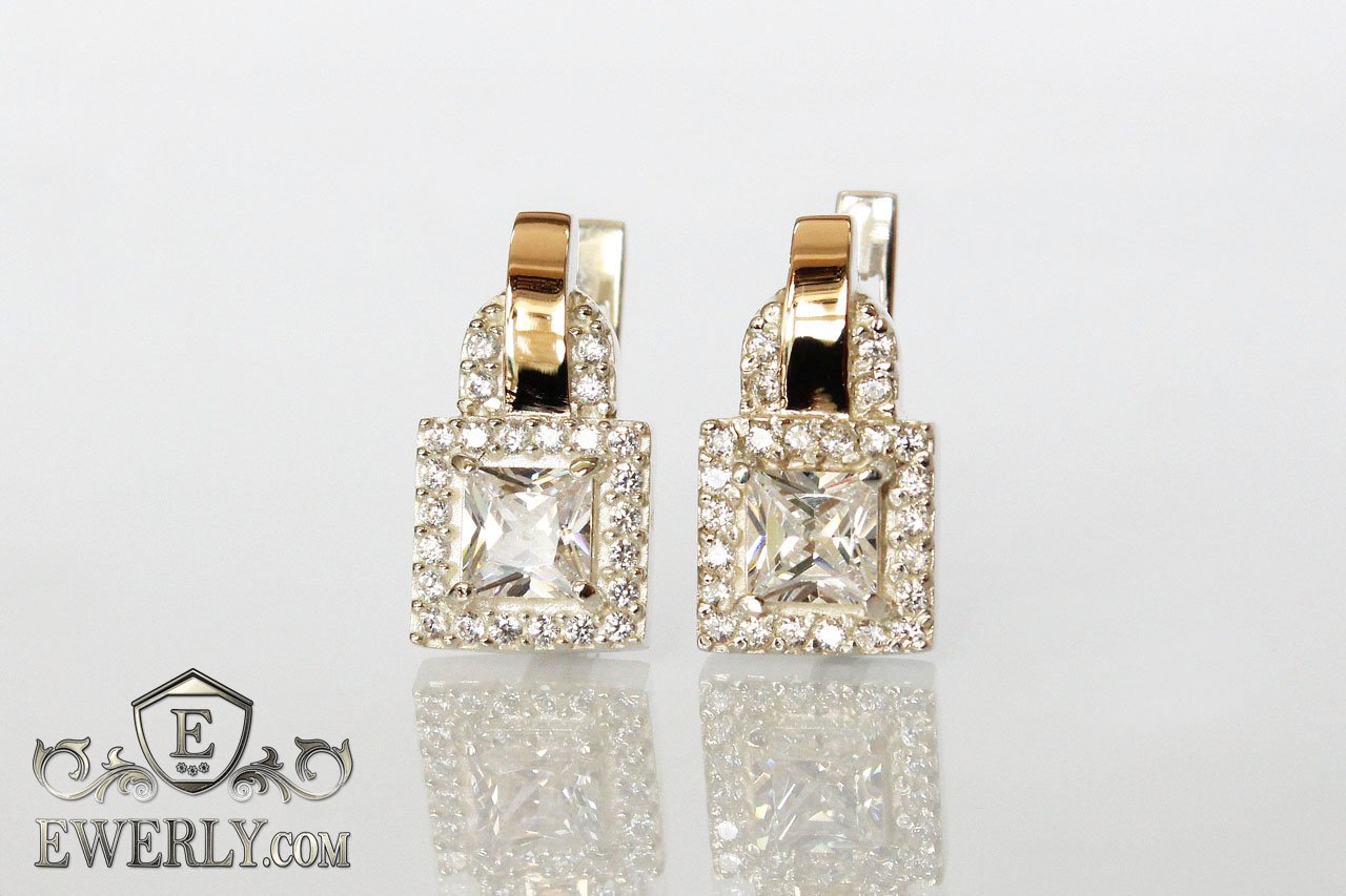 Серебряные серьги с золотыми вставками и белыми фианитами