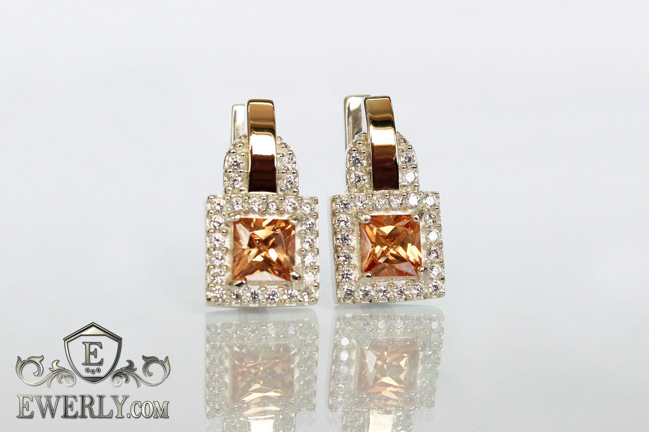 Серебряные серьги с золотыми вставками и фианитами (цвет шампань)