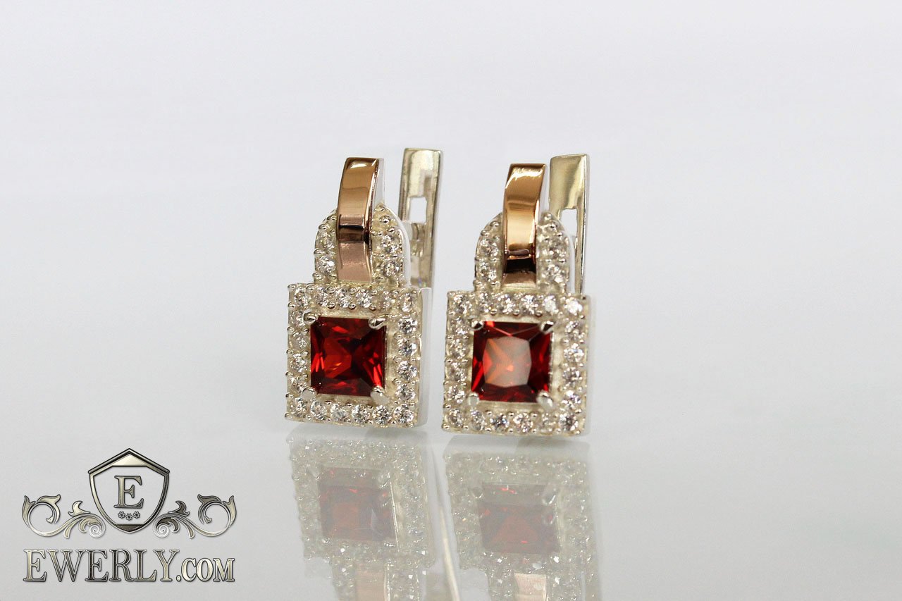 Серебряные серьги с золотыми вставками и фианитами (гранатовый цвет)
