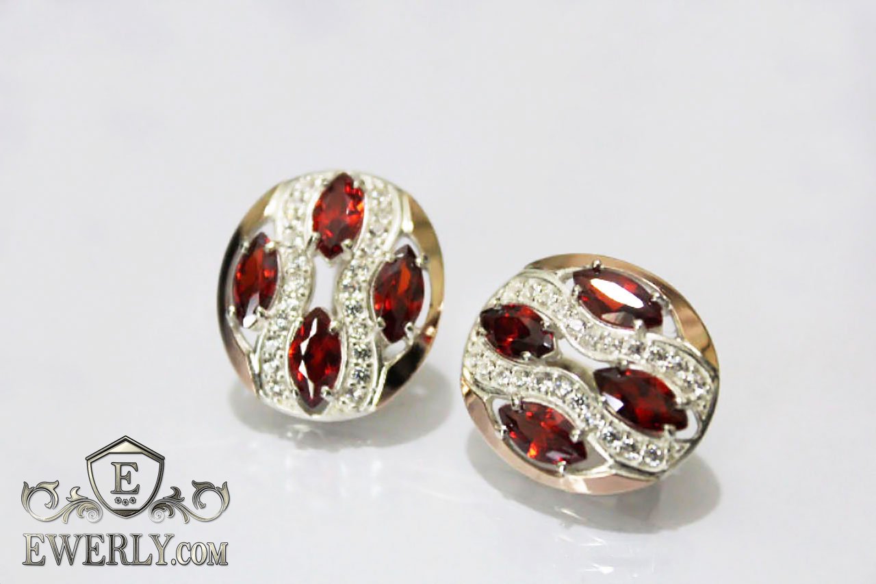 Серёжки из серебра с золотом для женщин (серебро 925 пробы, золото 375 пробы) с камнями - фианиты гранатового цвета.