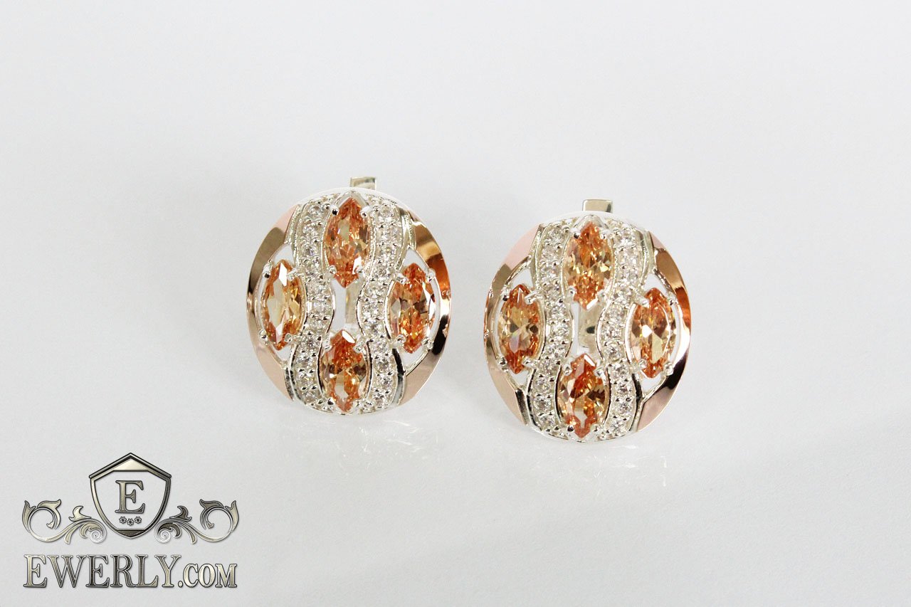 Серёжки из серебра с золотом для женщин (серебро 925 пробы, золото 375 пробы) с камнями - фианиты цвета-шампань.