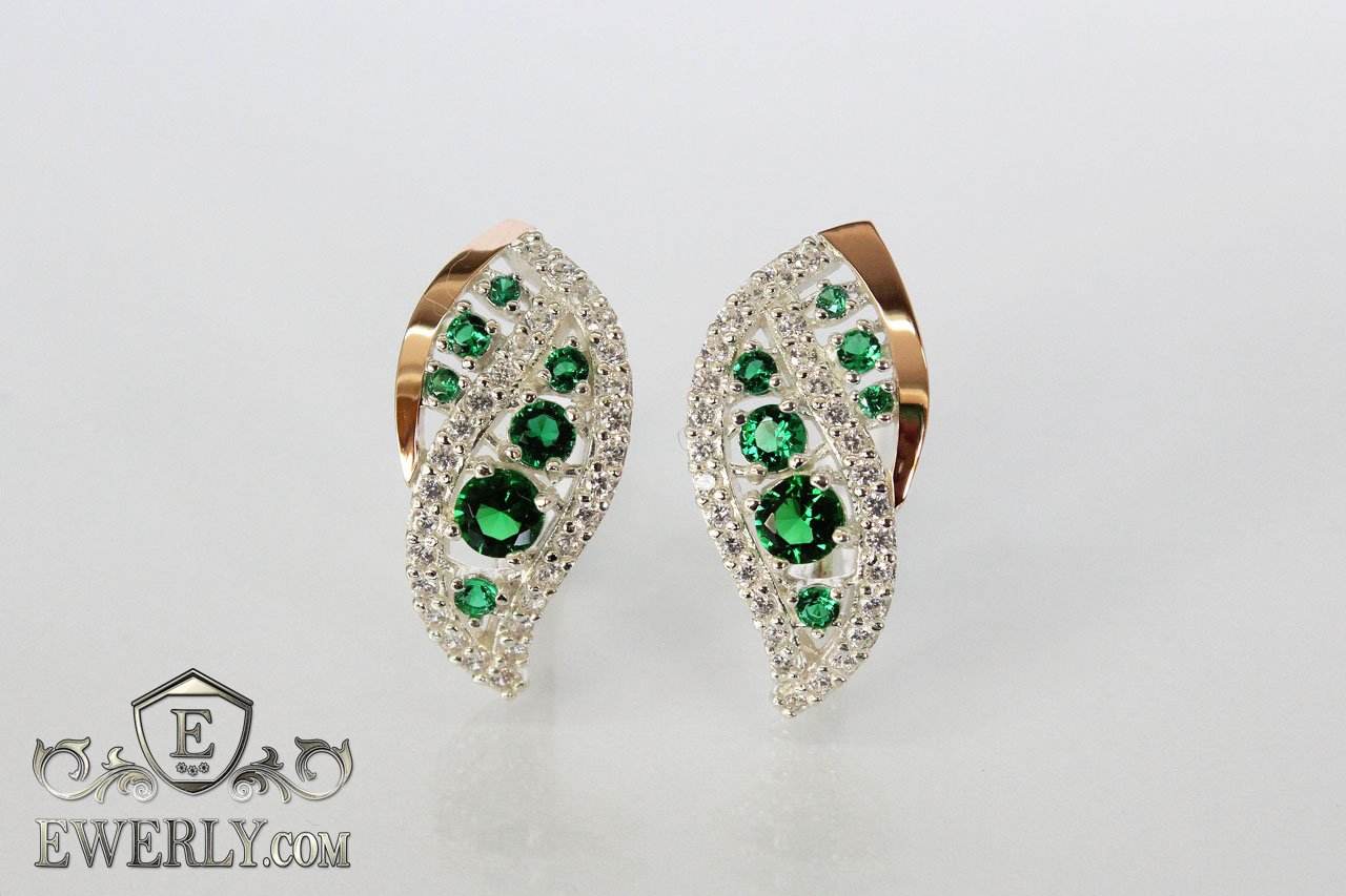 Женские серьги из серебра с золотом и зелёными камнями