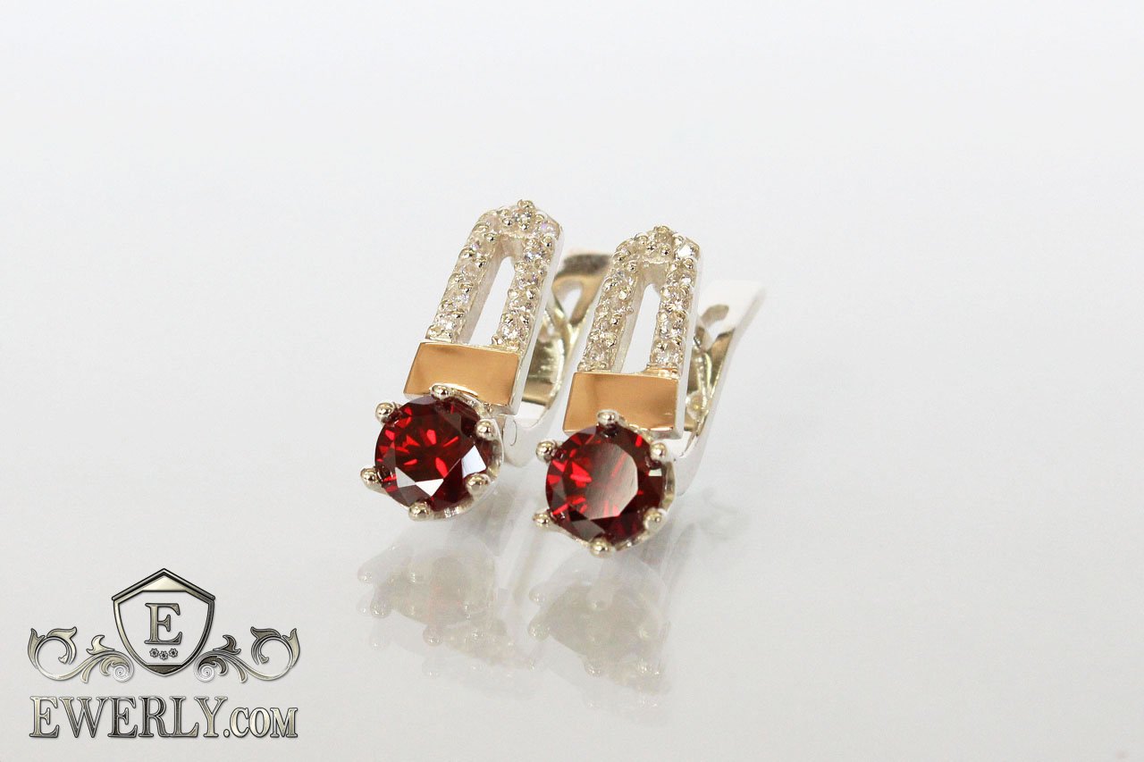 Серьги из серебра 925 пробы с золотыми пластинами 375 пробы с красными фианитами для женщин.