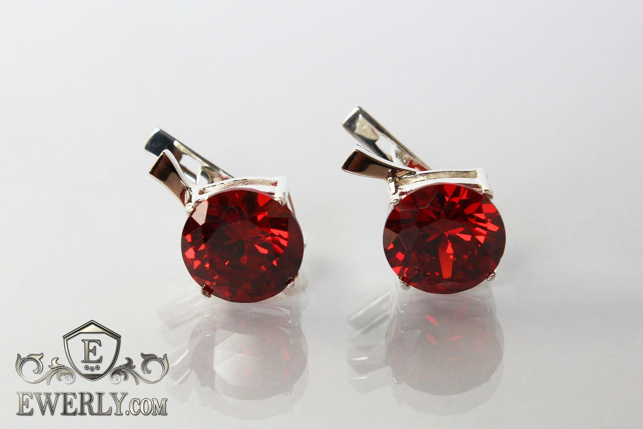 Женские серебряные серёжки с камнями (цвет граната) и золотом