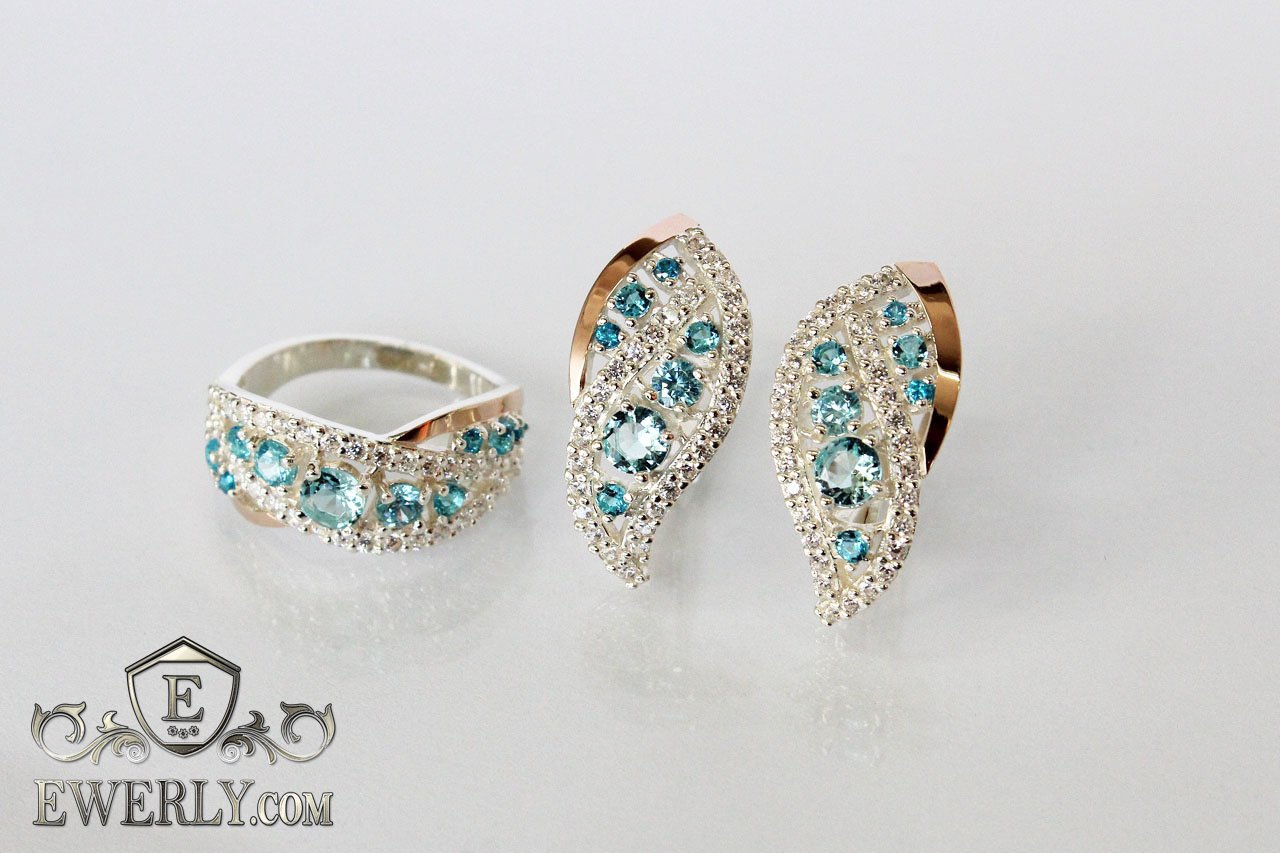 Женский набор: серьги и кольцо из серебра с золотом и светло-голубыми камнями