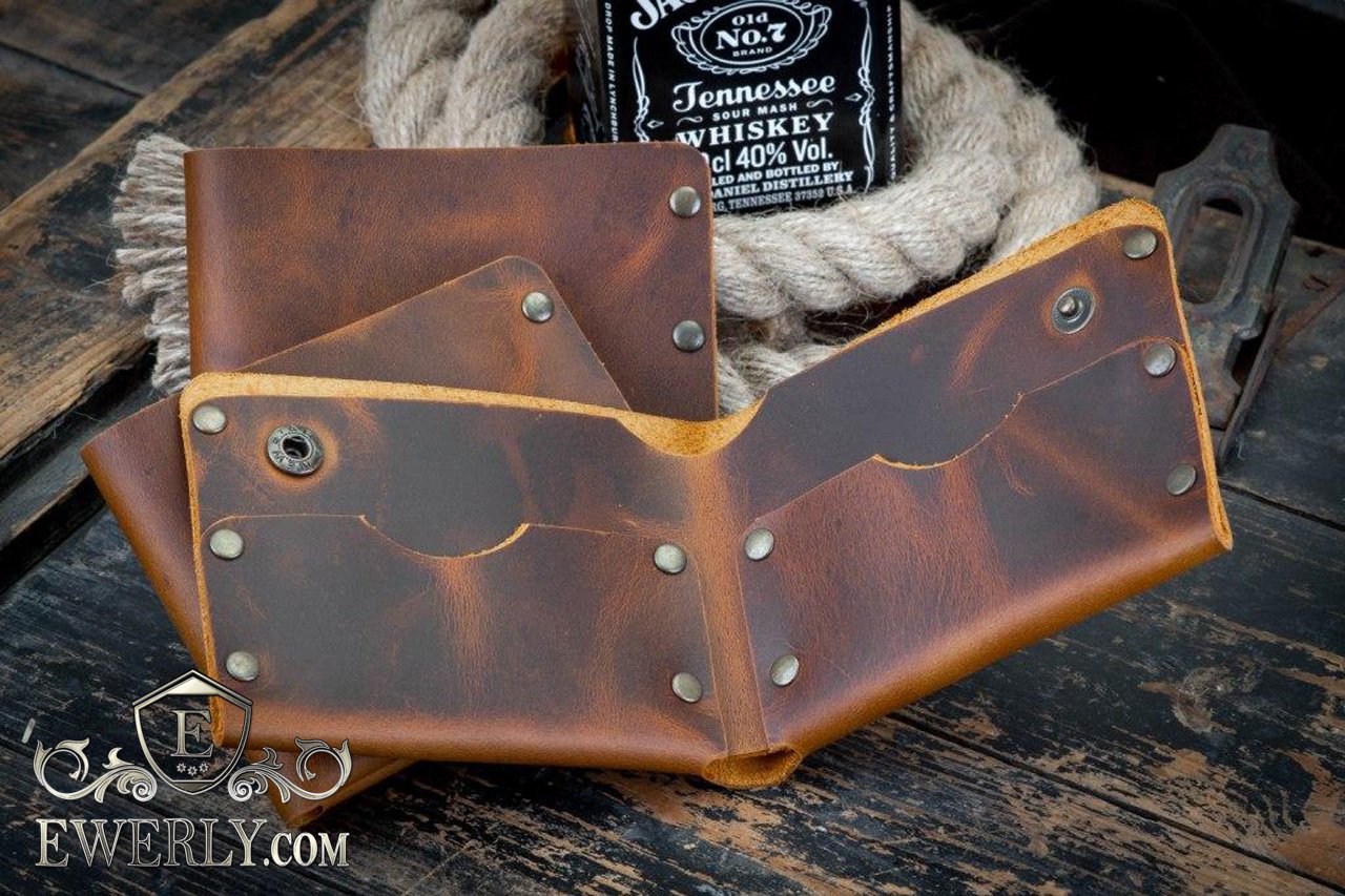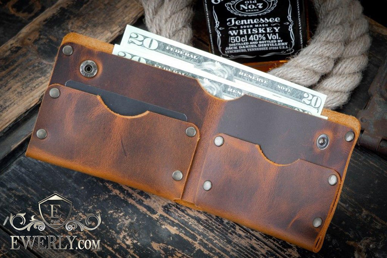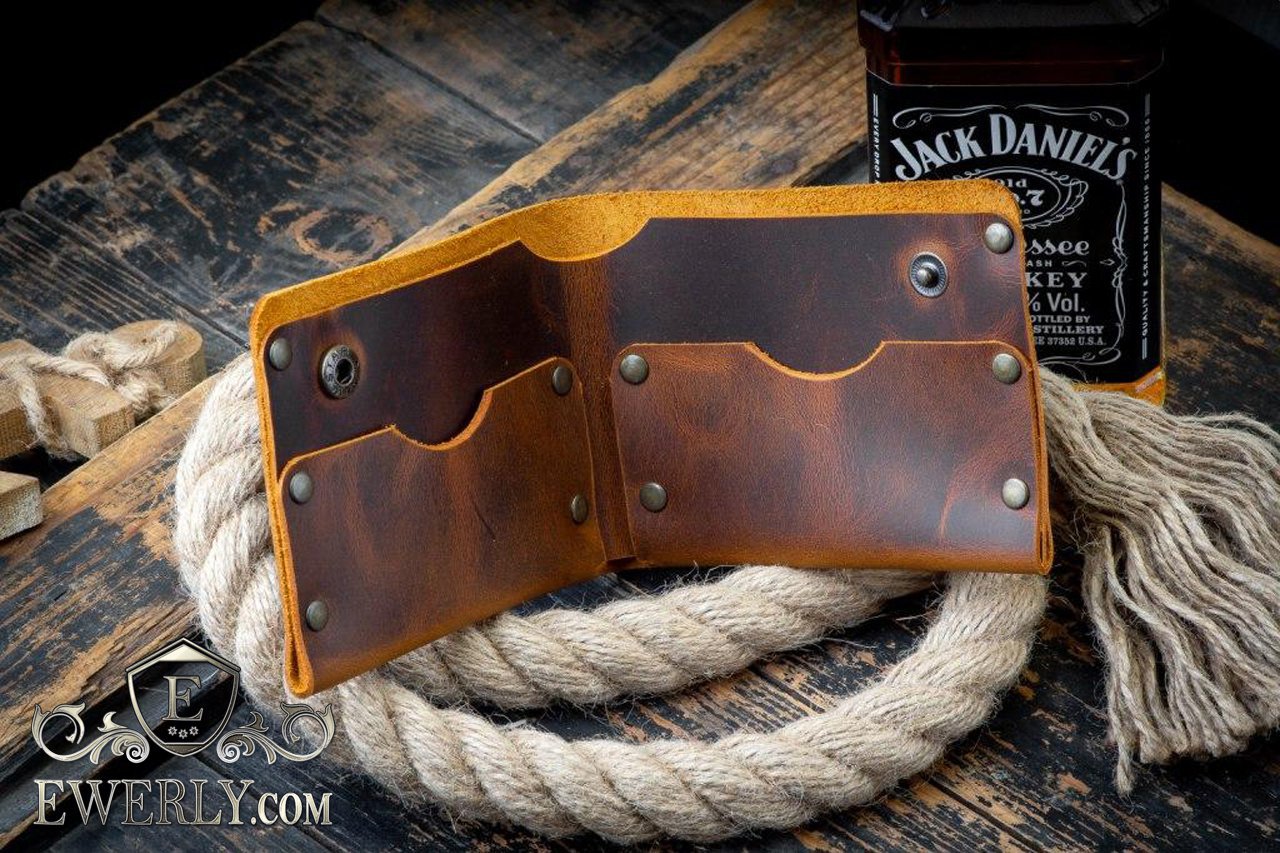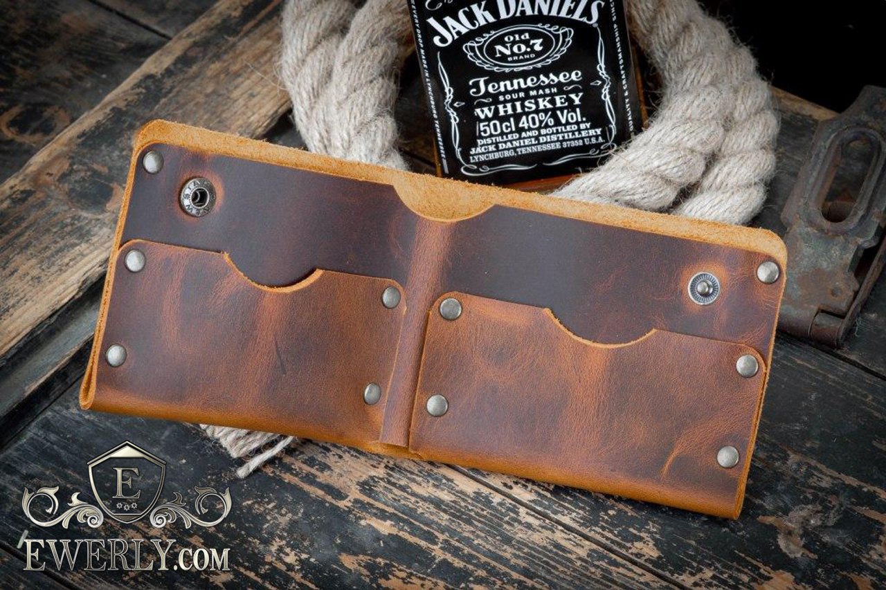 Мужской кошелёк ручной работы - изготовлен из натуральной кожи табачного цвета (коричнево-рыжего) и металлических заклепок. Чисто мужской кошелёк грубого помола высшего сорта! Имеет два отделения для банковских карт, каждое вмещает 2-3 карты, а также один раздел для бумажных денег под купюры всех номиналов.
