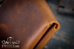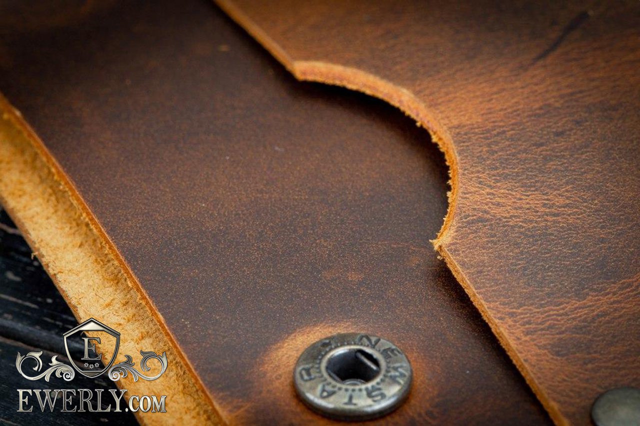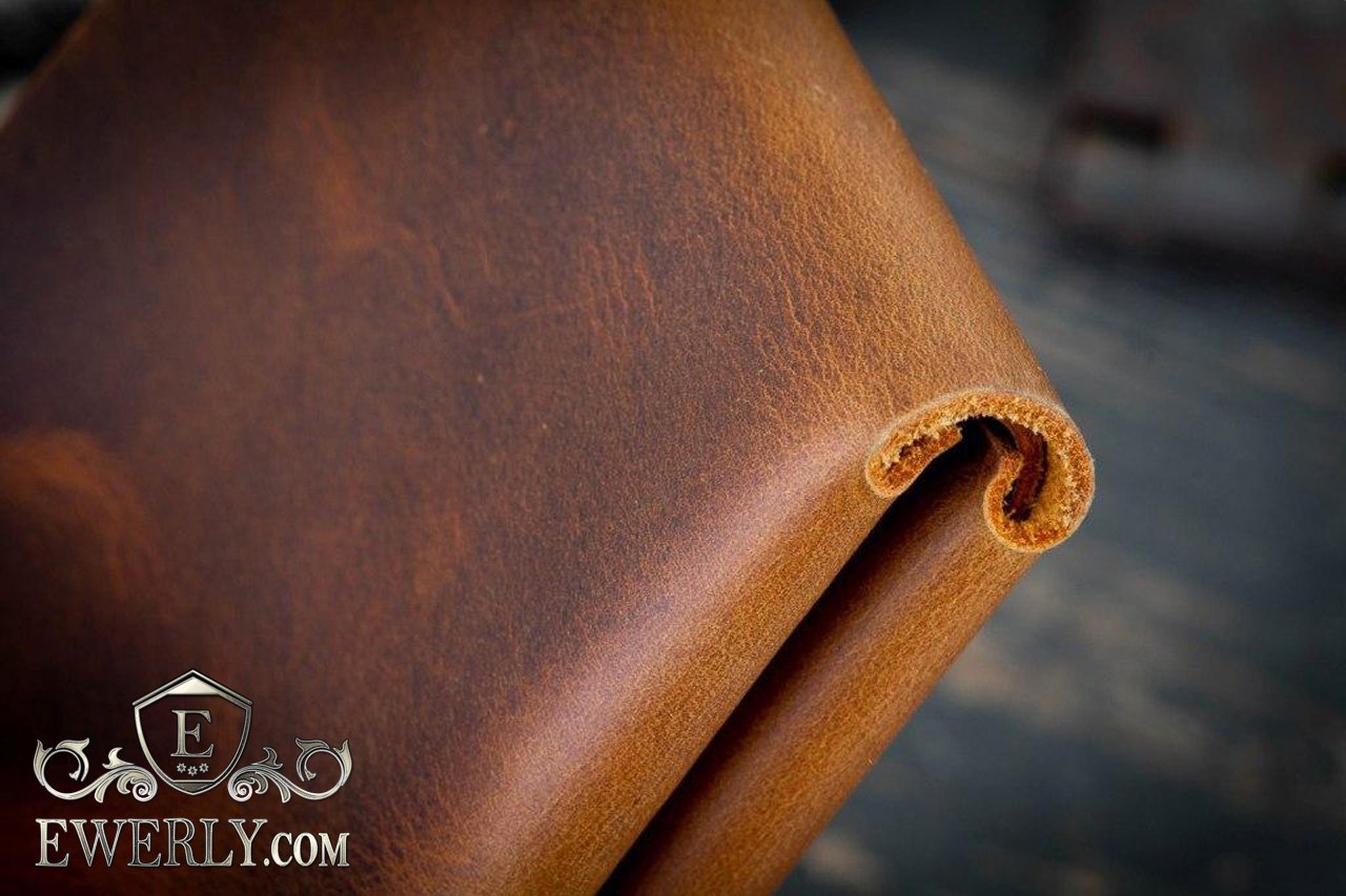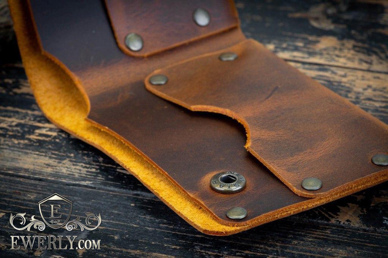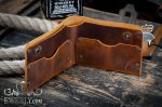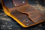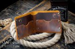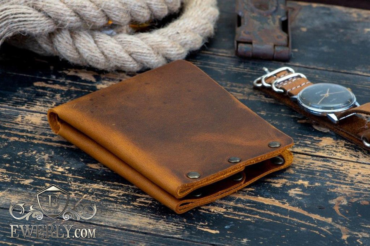 Мужской кошелёк ручной работы - изготовлен из натуральной кожи табачного цвета (коричнево-рыжего) и металлических заклепок. Чисто мужской кошелёк грубого помола высшего сорта! Имеет два отделения для банковских карт, каждое вмещает 2-3 карты, а также один раздел для бумажных денег под купюры всех номиналов.