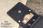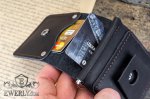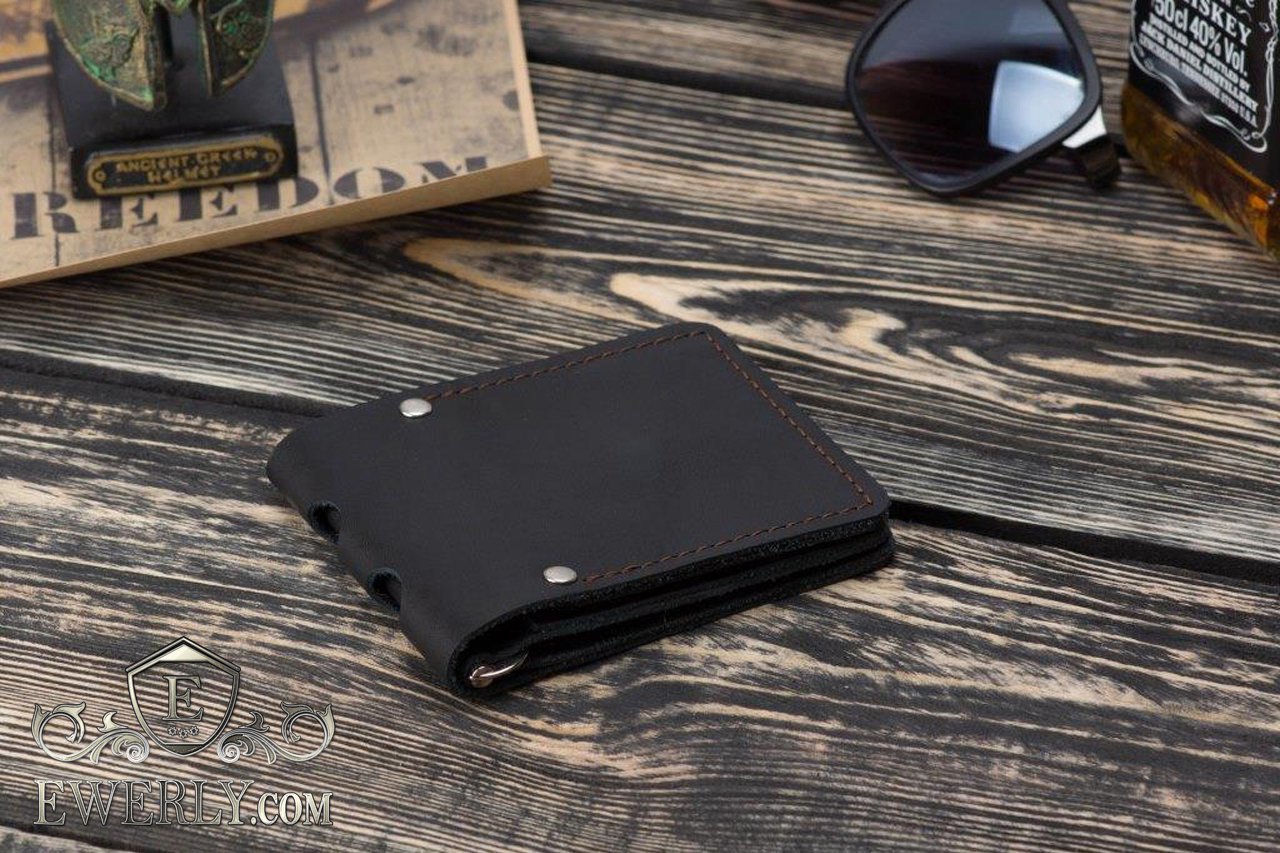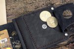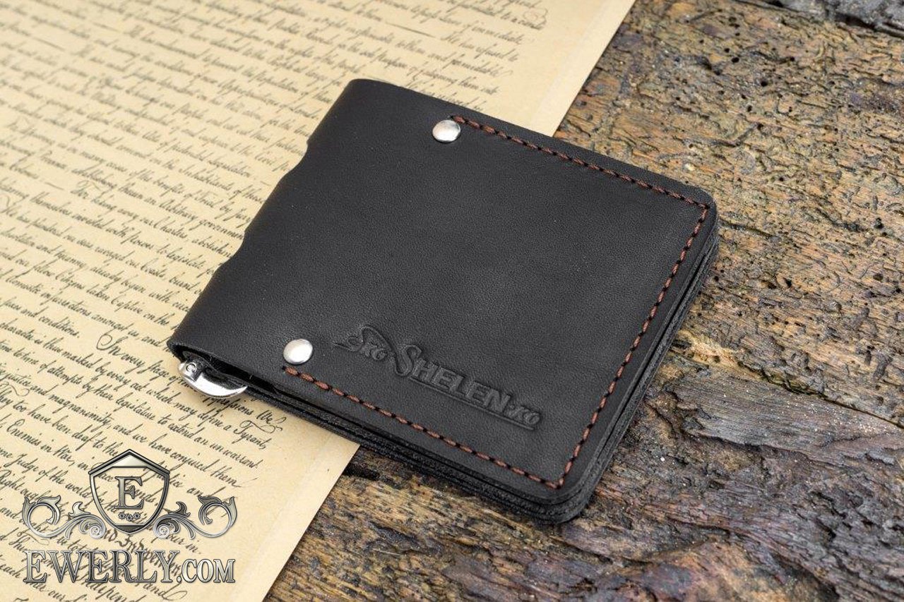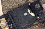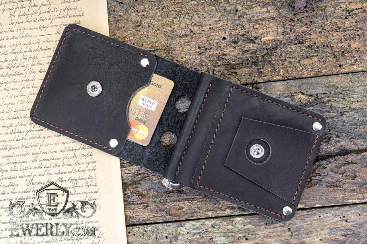 Зажим выполнен из натуральной кожи и является полностью ручной работой. Состоит из двух отделений, две стороны одного из которых изнутри скреплены кнопками. Внутри есть кармашек для мелочи и два раздела для банковских карт. Отделение для бумажных денег вмещает в себя купюры всех номиналов.