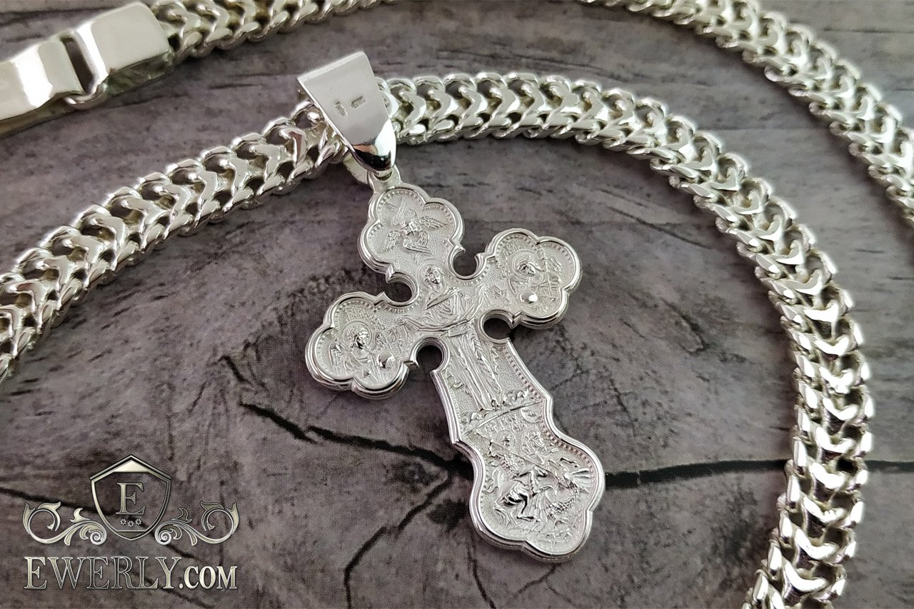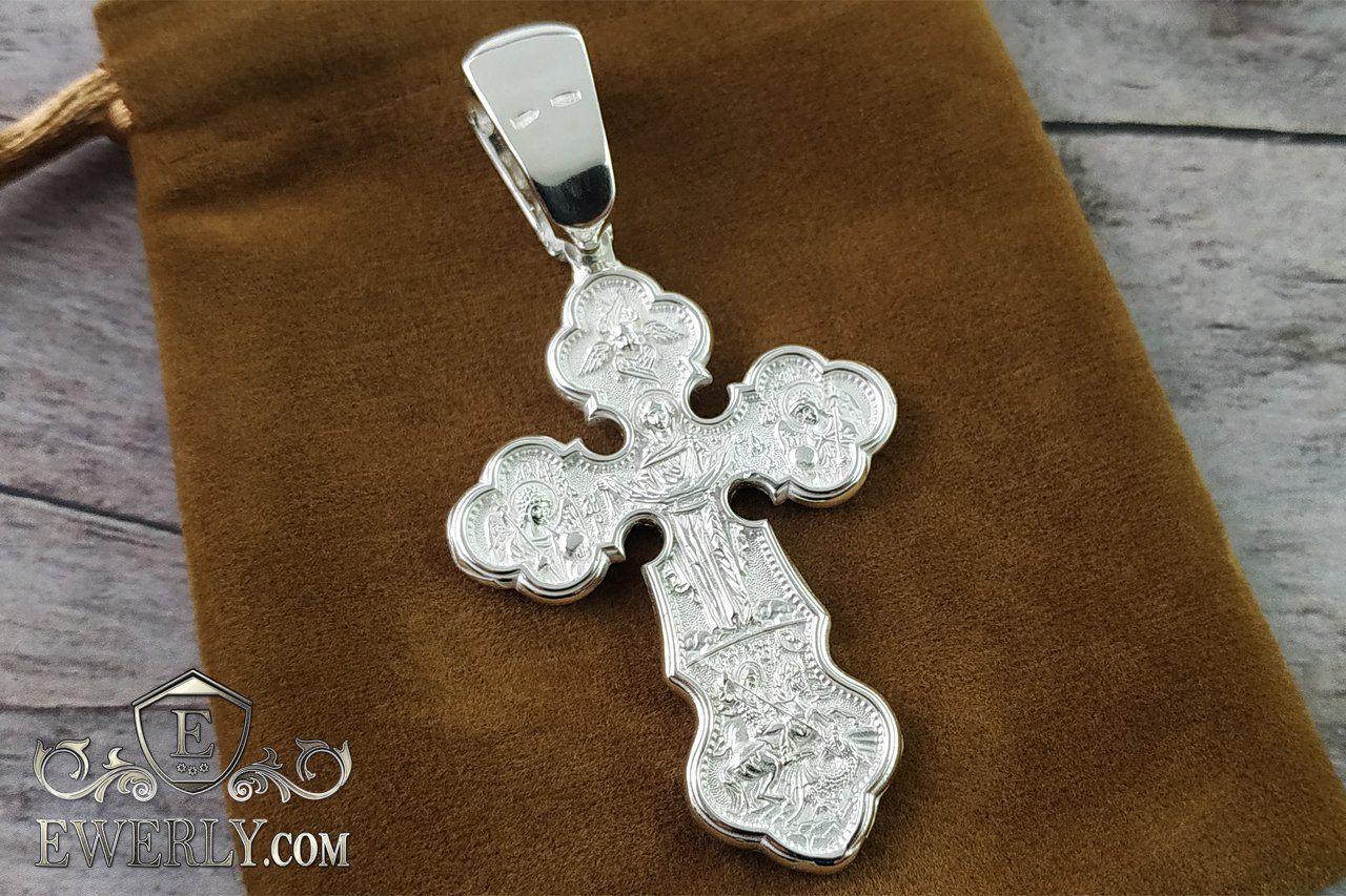 Изображено на кресте: Распятие Христово. Покров Пресвятой Богородицы. Великомученик Георгий Победоносец. Православный крест.