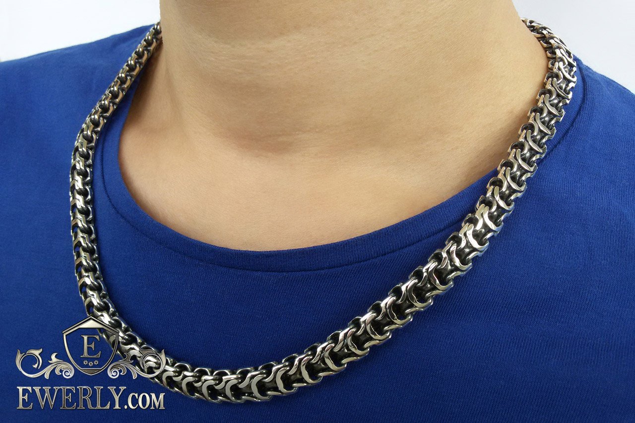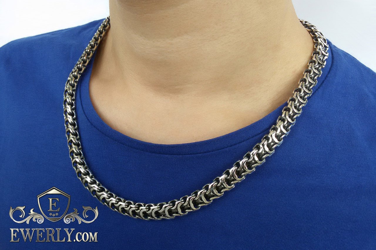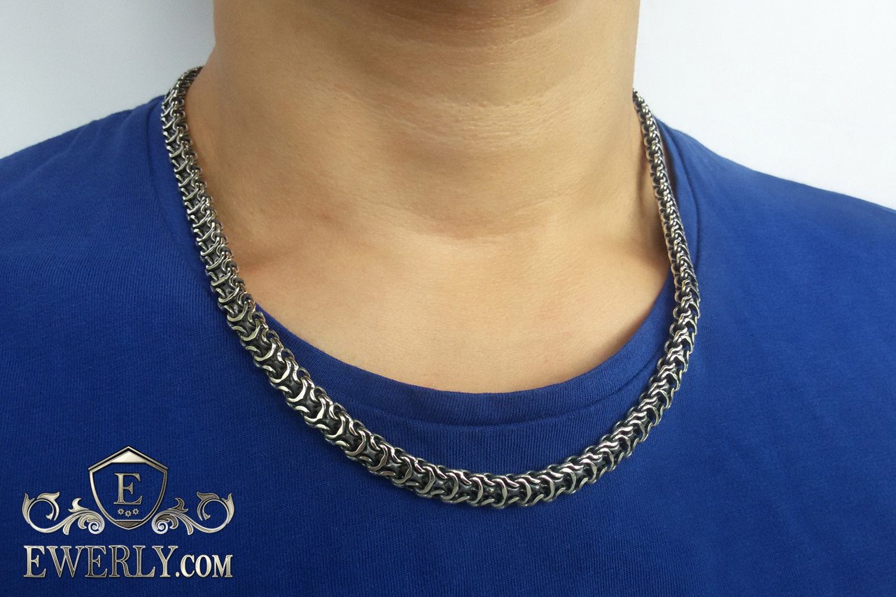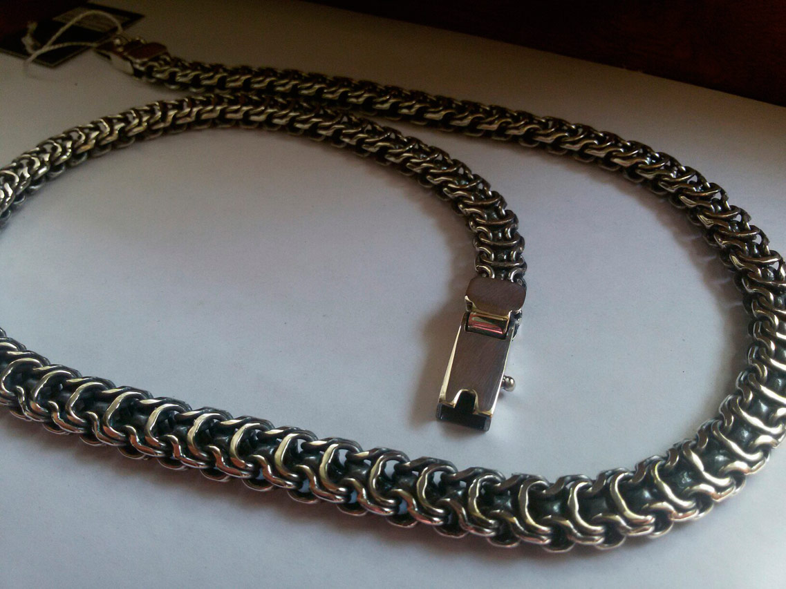 Полновесная цепочка. Очень популярное среди мужчин плетение «Рамзес», также на просторах интернета данное плетение можно увидеть под названием «Двойной обратный бисмарк». В особенности мужское внимание привлекают толстые серебряные цепочки из «Двойного обратного бисмарка» с размерами близкими к размерам на фото. И тем не менее, если такая цепочка лично для Вас смотрится на шее весьма громоздкой или наоборот маловатой, то Вы без особого труда можете откорректировать практически любой её параметр под свои вкусы, в том числе есть возможность выбрать как с чернением, так и нечернёную или же с родированием.