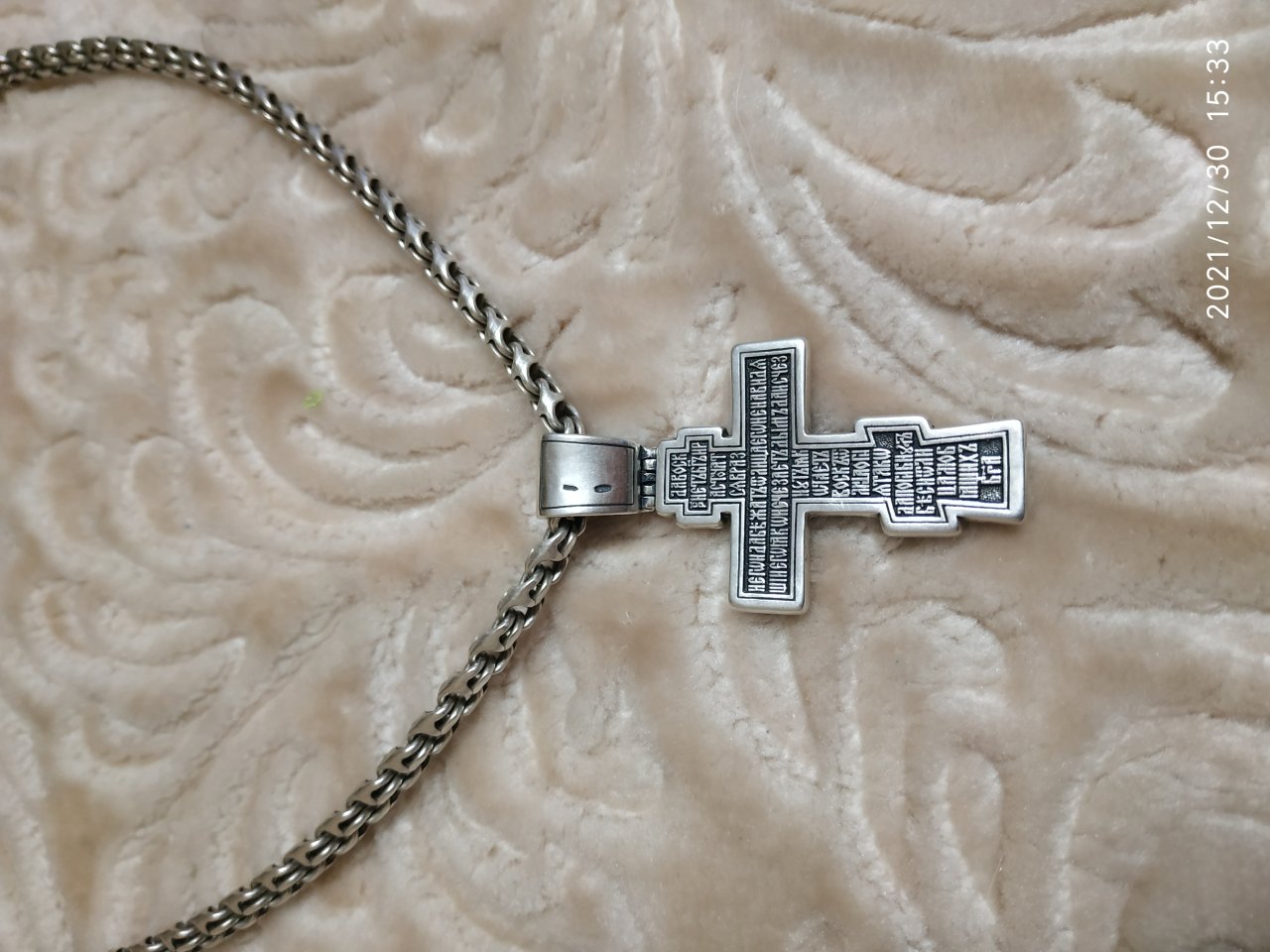 На обороте написаны начальные стихи оградительной молитвы Честному Кресту Господню. Эту молитву читают в опасности, а также носят при себе для защиты от злых сил: «Да воскреснет Бог, и расточатся врази Его, и да бежат от лица Его ненавидящии Его. Яко исчезает дым, да исчезнут; яко тает воск от лица огня, тако да погибнут беси от лица любящих Бога и знаменующихся крестным знамением, и в веселии глаголющих: радуйся, Пречестный и Животворящий Кресте Господень, прогоняяй бесы силою на тебе пропятаго Господа нашего Иисуса Христа, во ад сшедшаго и поправшаго силу диаволю, и даровавшаго нам тебе Крест Свой Честный на прогнание всякаго супостата. О, Пречестный и Животворящий Кресте Господень! Помогай ми со Святою Госпожею Девою Богородицею и со всеми святыми во веки. Аминь».