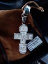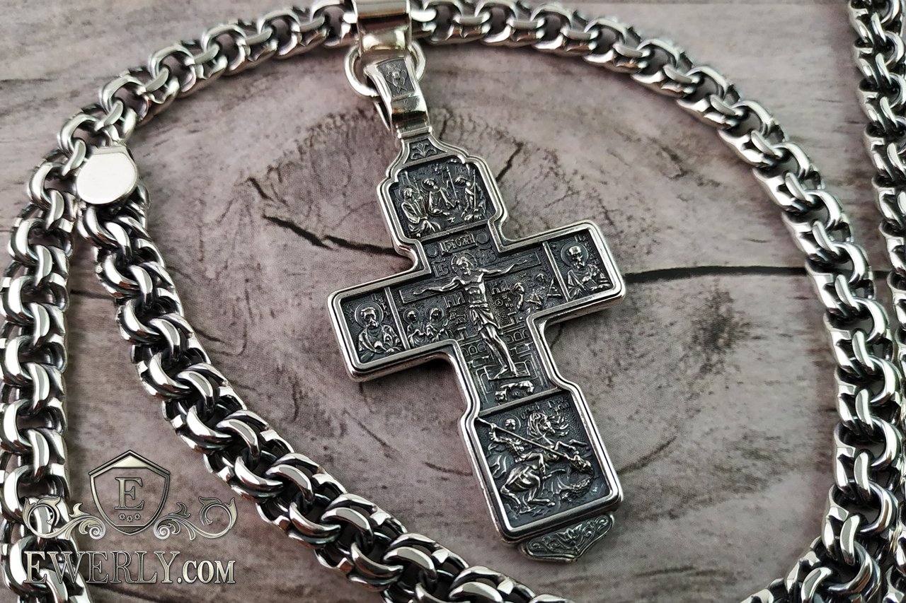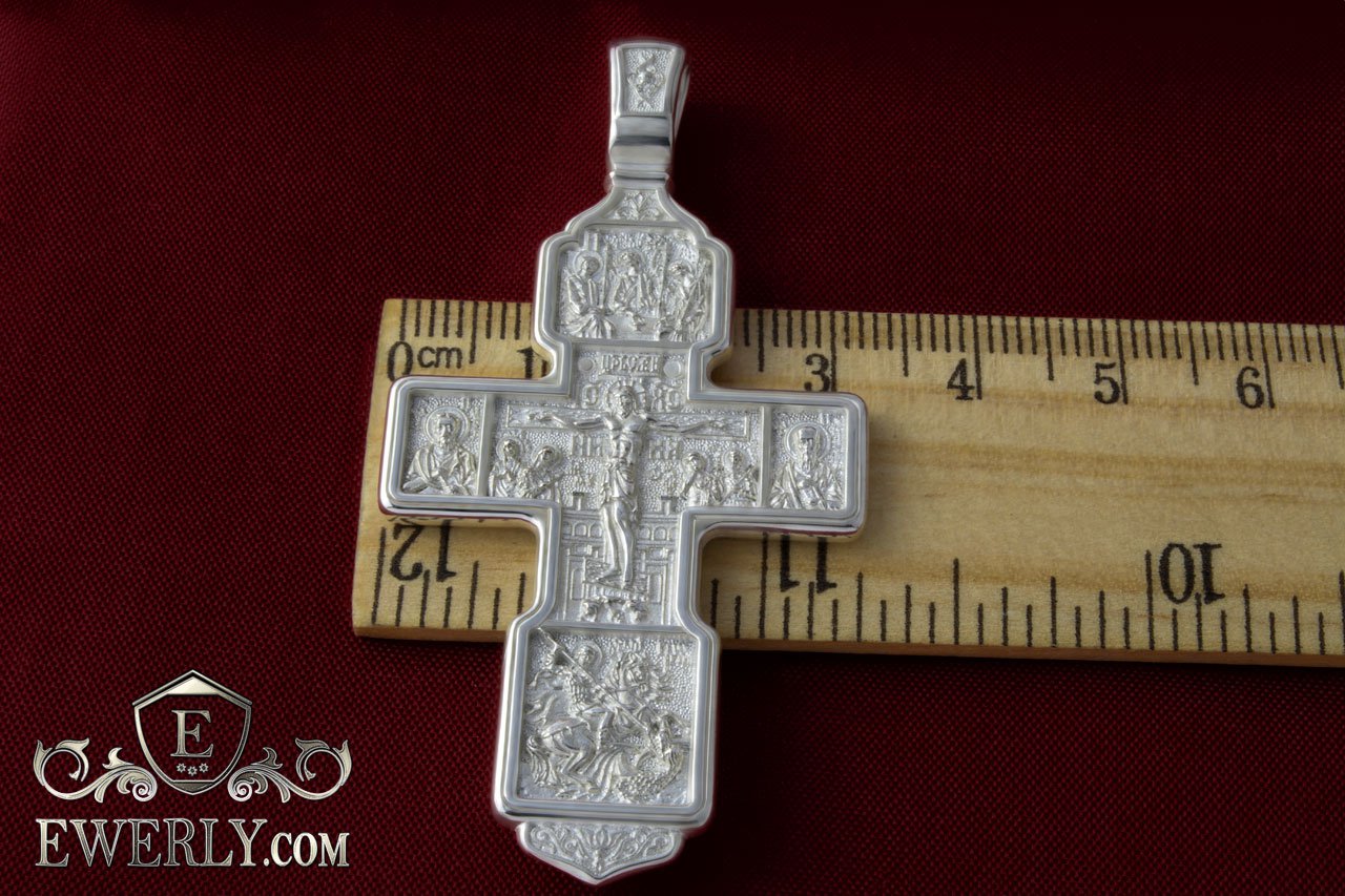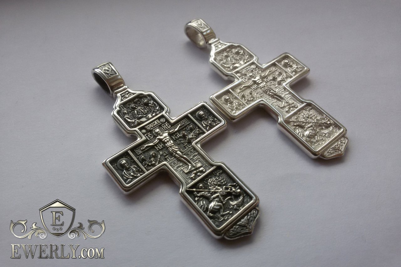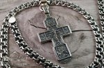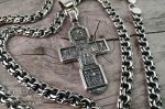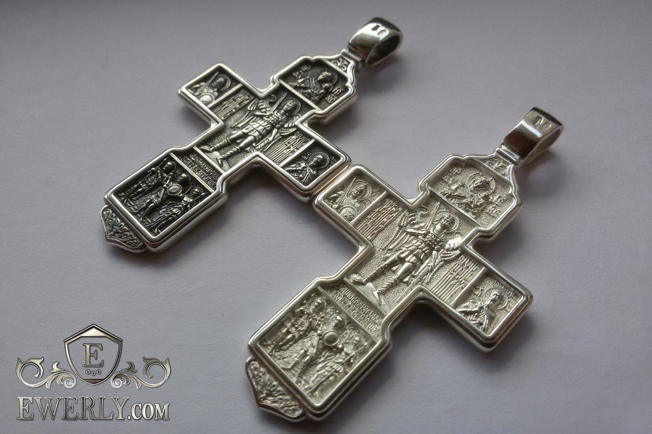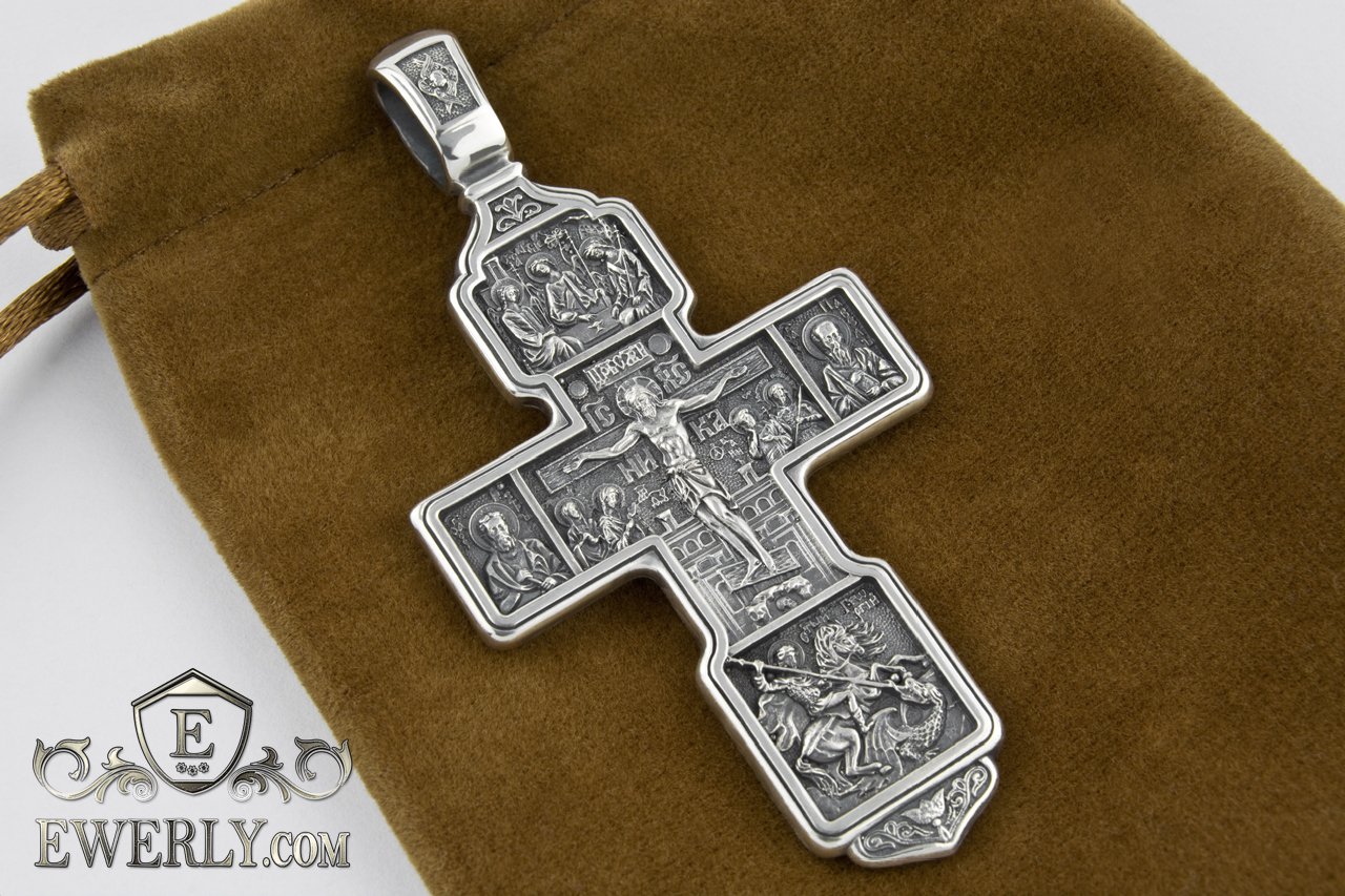 Изображено на кресте: Распятие Христово с предстоящими. Святая Троица. Архангел Михаил. Святые Воины. Тихвинская икона Божией Матери. Православный крест.Высота: 8 мм