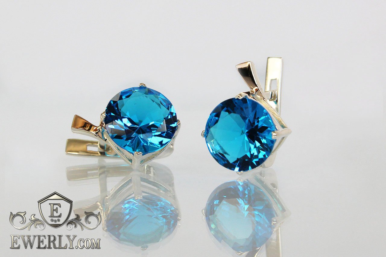 Женские серебряные серёжки с золотыми элементами и голубыми камнями - фианитами.