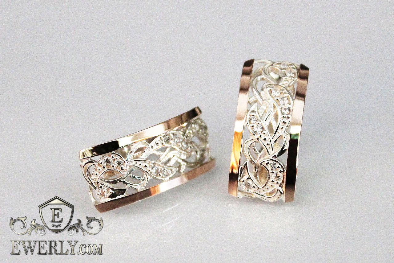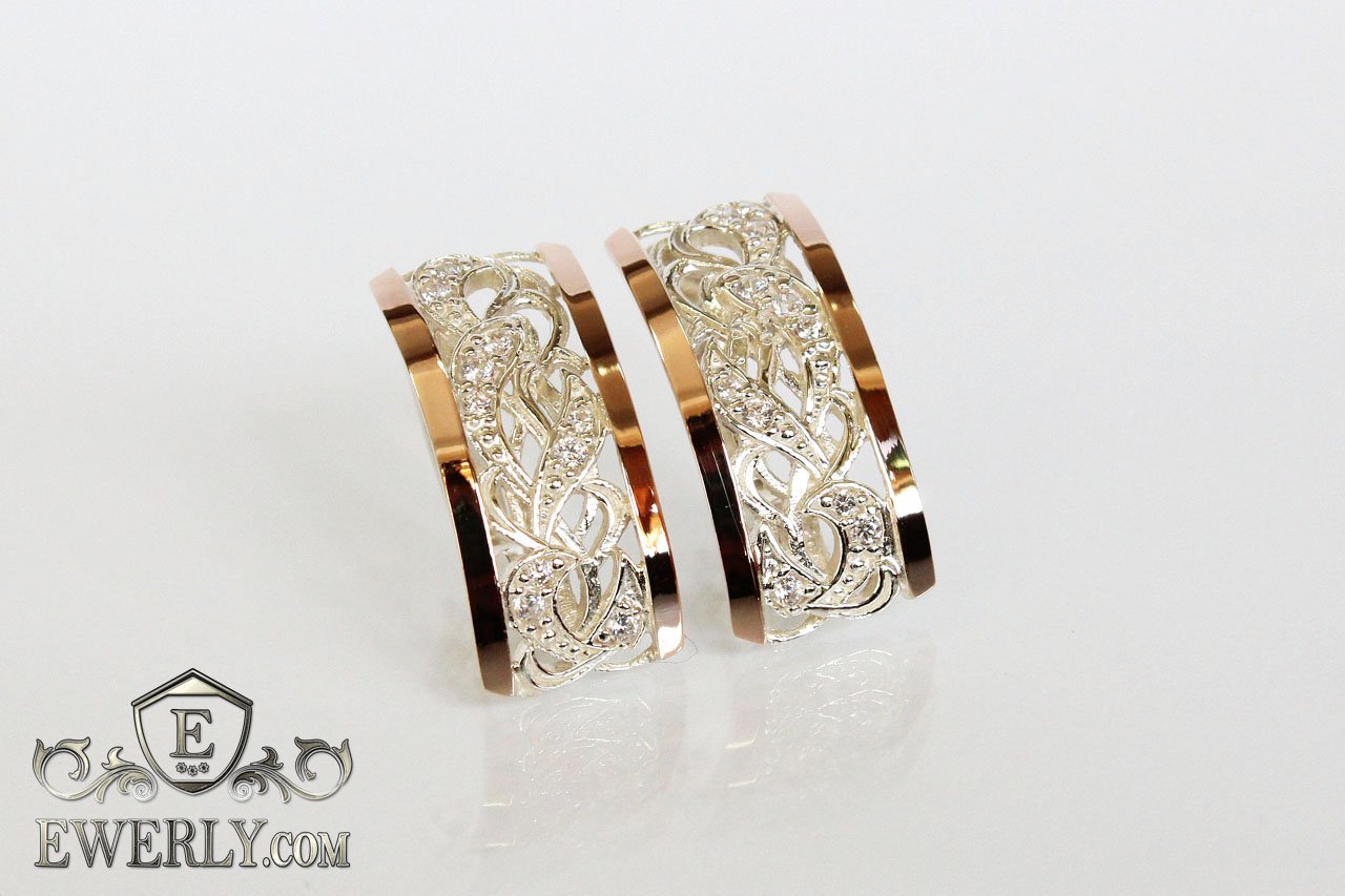 Женские серьги из серебра с золотом 375 пробы и белыми камнями.