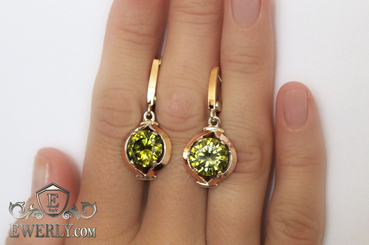 Серебряные серёжки 925 пробы для девушки с золотыми вставками 375 пробы и камнями - фианитами (цвет-олива).