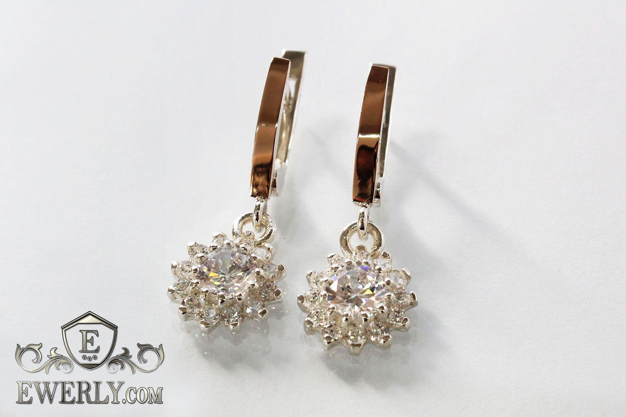 Серёжки из серебра с белыми камнями для девушки (золотые вставки)