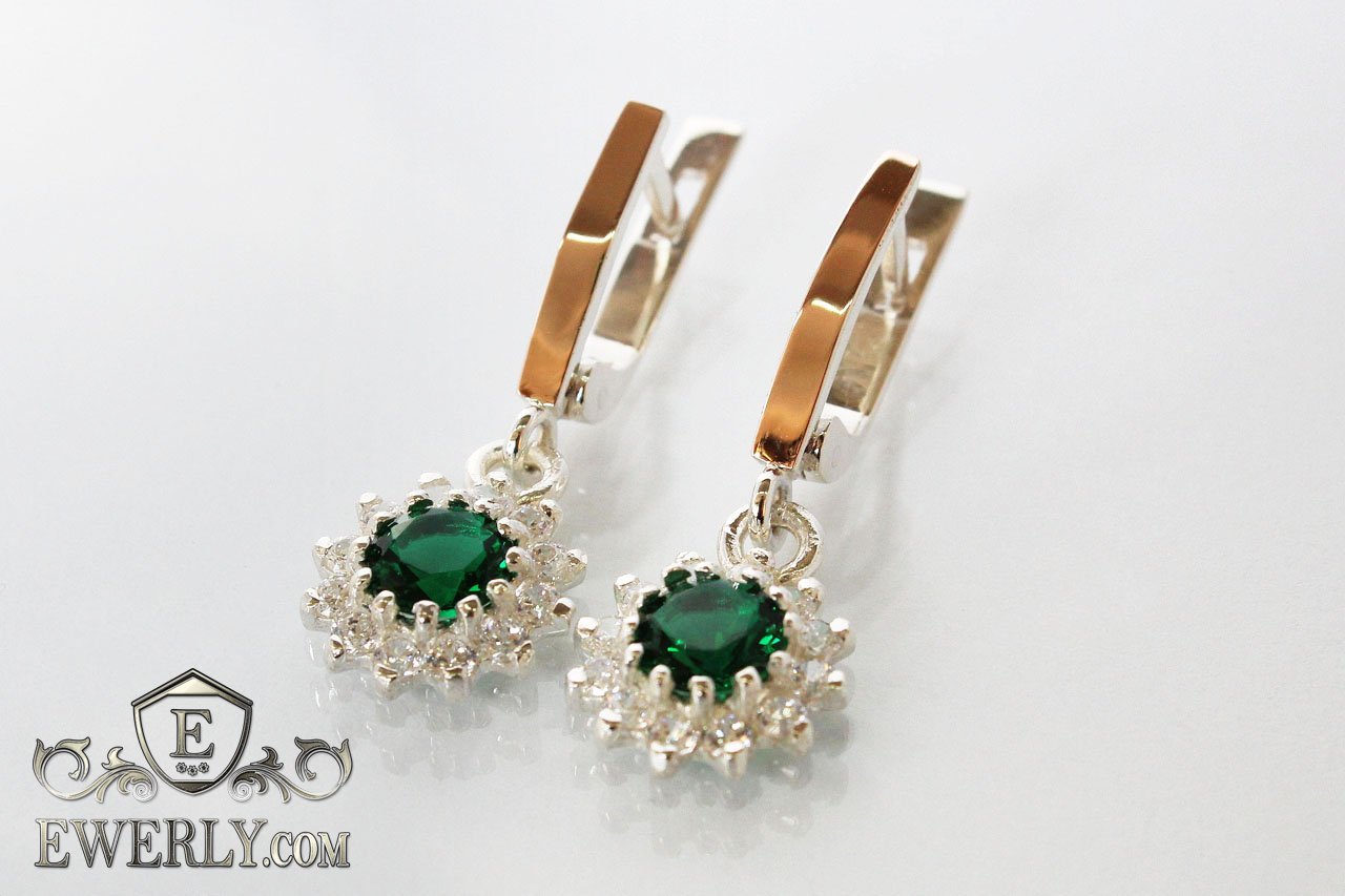 Серёжки из серебра 925 пробы для девушки с золотыми вставками 375 пробы и зелёными камнями - фианитами.
