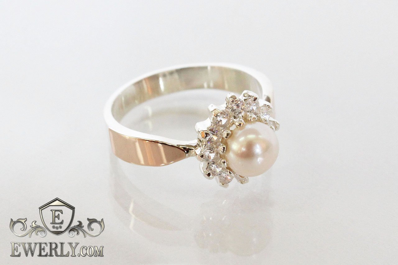 Женское кольцо из серебра 925 пробы с золотыми вставками 375 пробы с камнями (белый фианит в центре в виде жемчуга).
