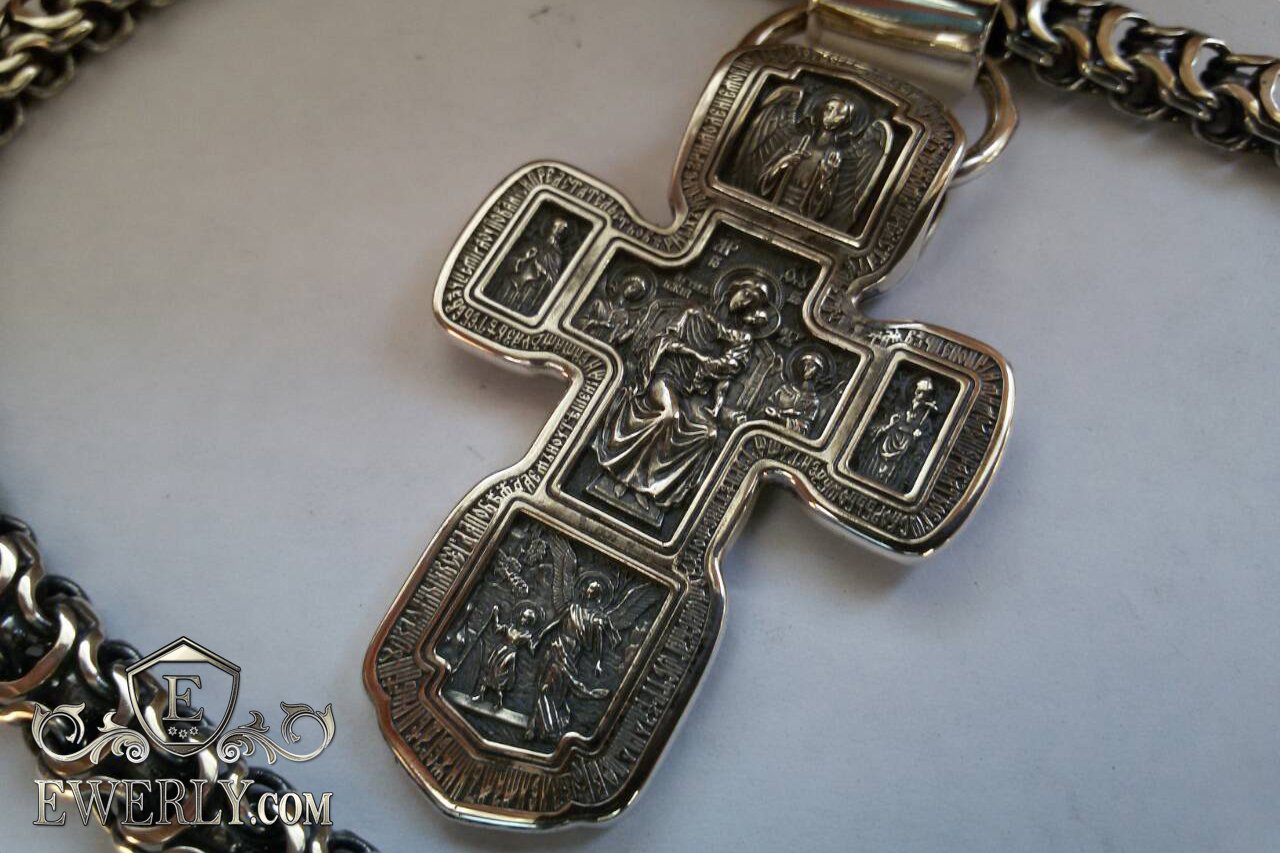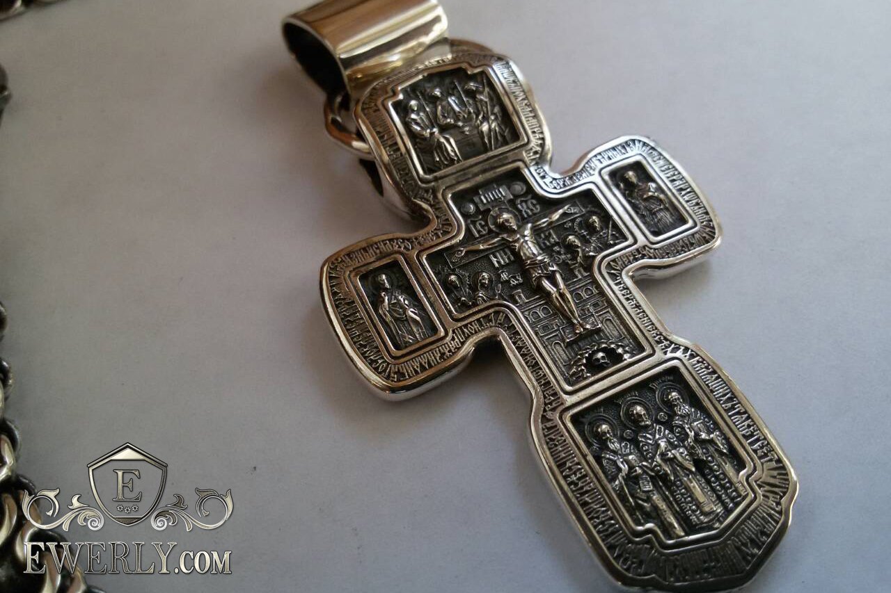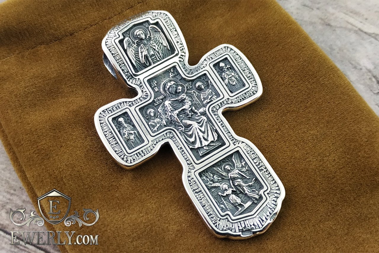 Вокруг Распятого Спасителя на кресте расположены иконы наиболее почитаемых на Руси святых, небесных помощников в самых разных нуждах, духовных и семейных проблемах.