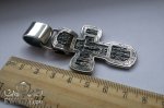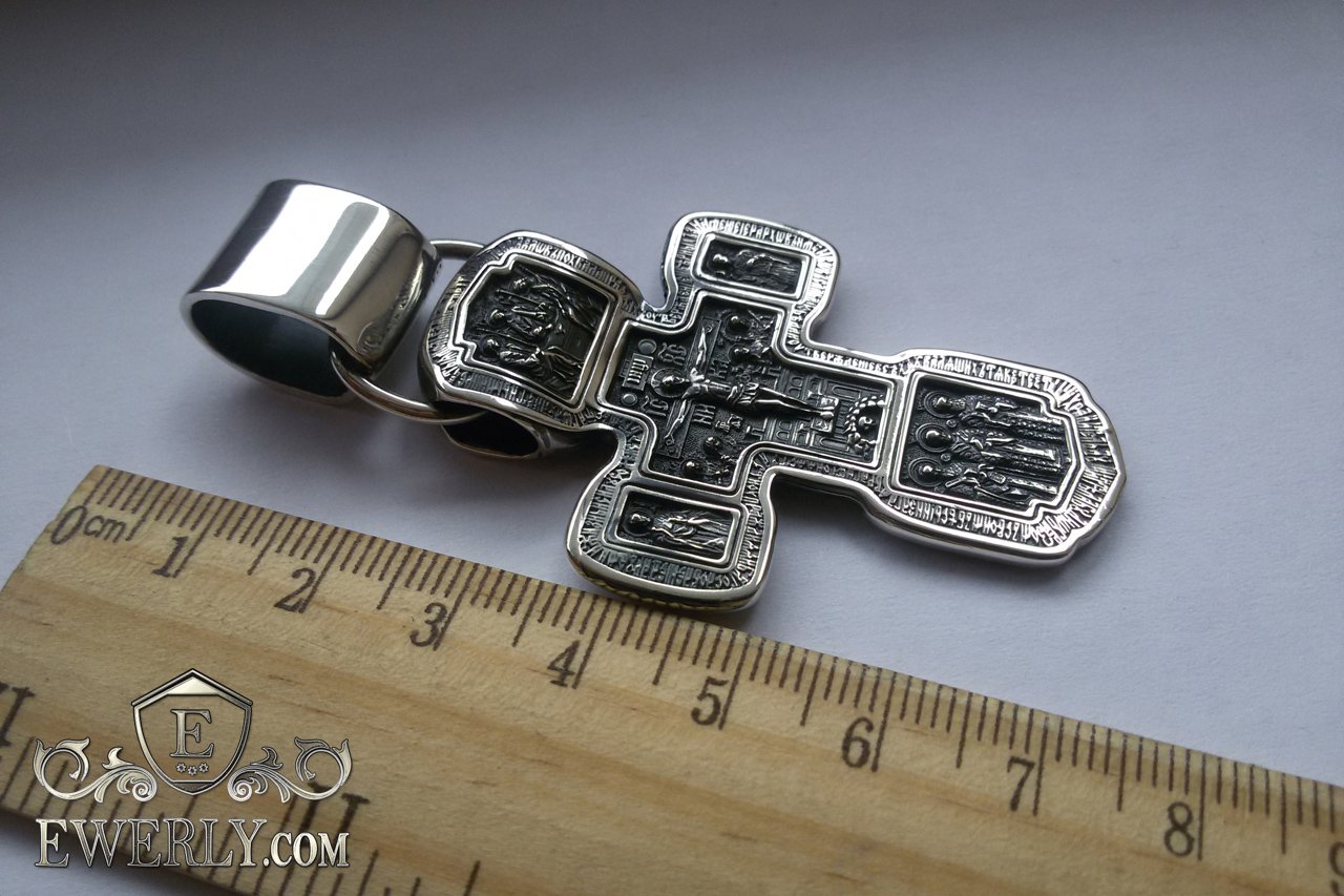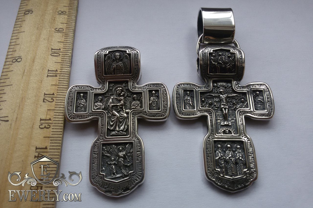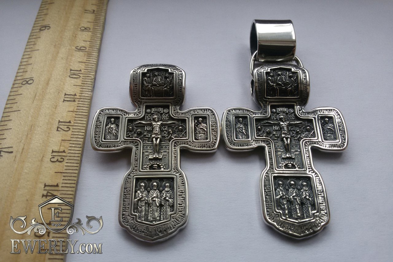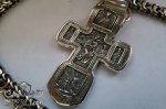 Изображено на кресте: Распятие Христово. Святая Троица. Святой Николай Чудотворец. Мученик Трифон. Три святителя. Икона Божией Матери "Толгская". Ангел Хранитель. Преподобный Сергий Радонежский. Святой Спиридон Тримифунский.1. Размер: 7 х 4 мм