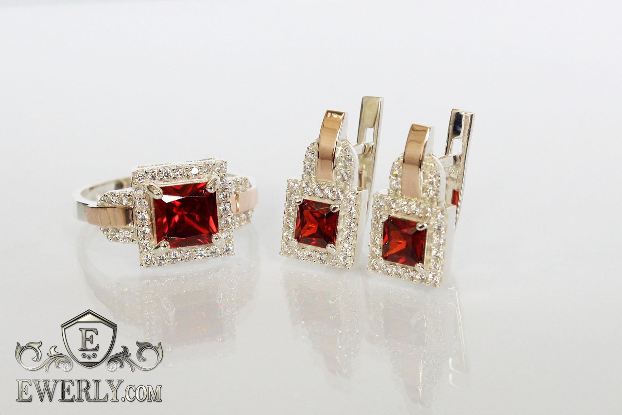 Жіночі срібні сережки і кільце з золотом і червоними каменями