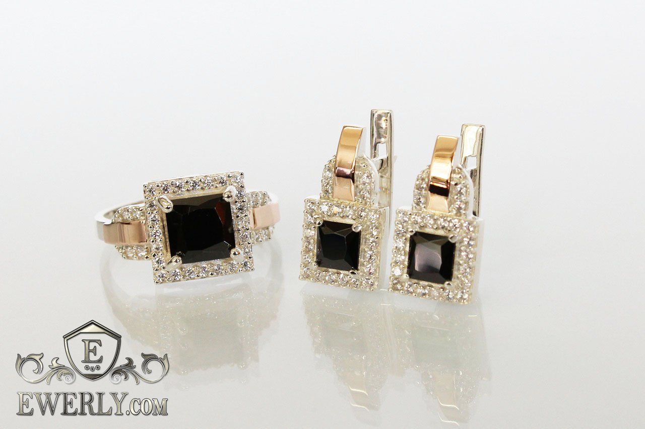 Жіночі срібні сережки і кільце з золотом і чорними фіанитами