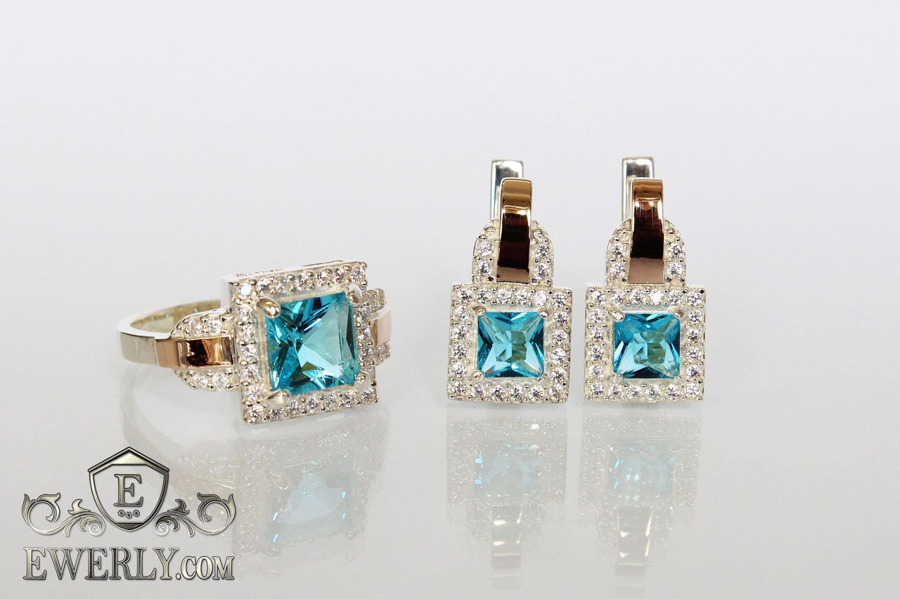 Жіночі срібні сережки і кільце з золотом і світло-блакитними фіанитами