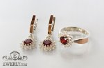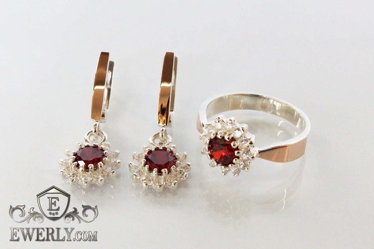 Жіночий комплект: срібний перстень і сережки з червоними фіанітами