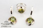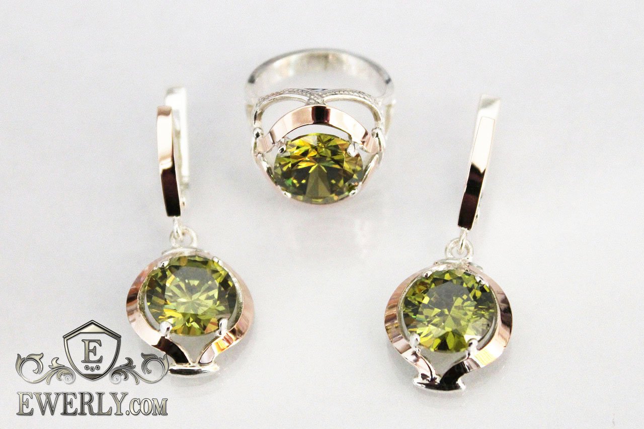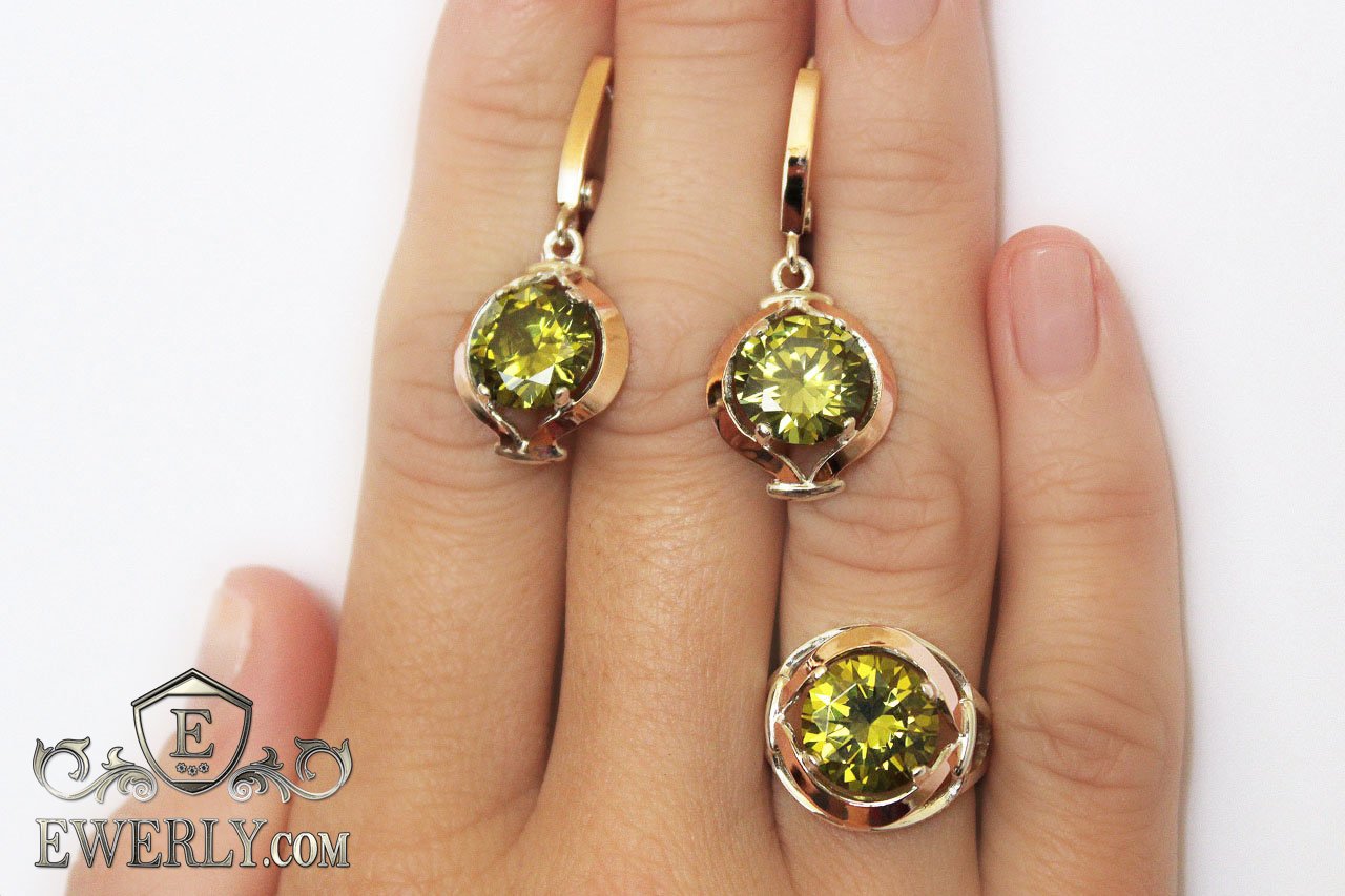 Жіночий комплект: срібний перстень і сережки з камінням кольору олива